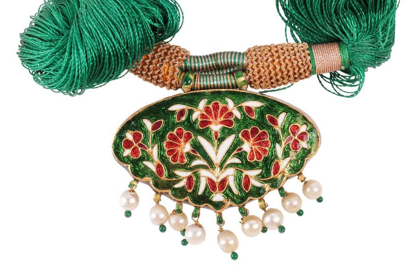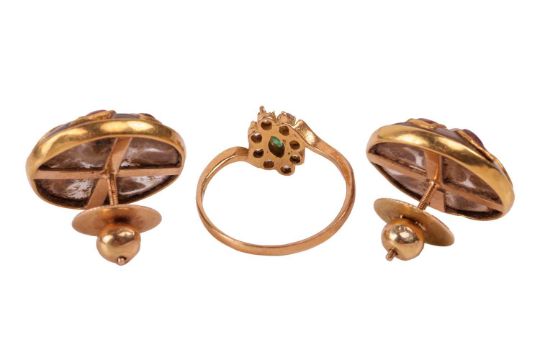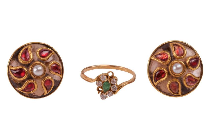 A small group of jewellery items including two Indian gilt bangles, an Indian necklace with an enamel and gem-set pendant featuring a cultured pearl fringe detail, a gem-set floral cluster ring, with two stones missing, in a yellow metal mount tested as 18ct gold and a pair of gem-set earrings, in yellow metal mounts tested as 18ct gold; total weighable: 14.8 grams (4)
