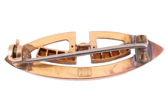 A citrine and seed pearl brooch, comprising a seed pearl flanked by two channels of four mixed-cut square citrines, the brooch of ellipse form, yellow metal surface testing as 9ct, with base metal pin and locking C clasp fitting, brooch measuring 3.7cm x 1.1cm, 2.6 grams.