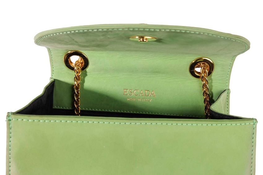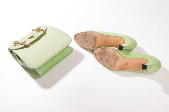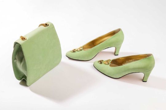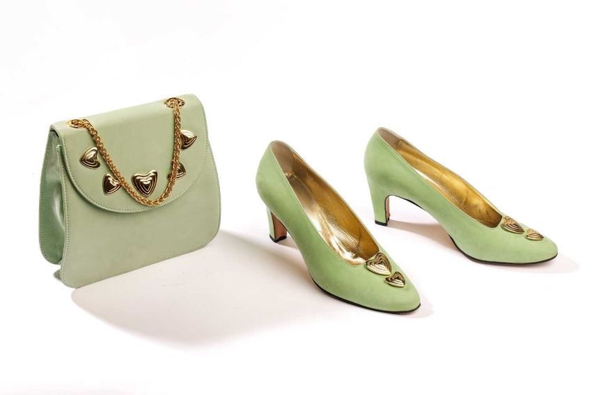 Escada - a pair of heels in mint suede with heart motifs; together with matching handbag. (2)