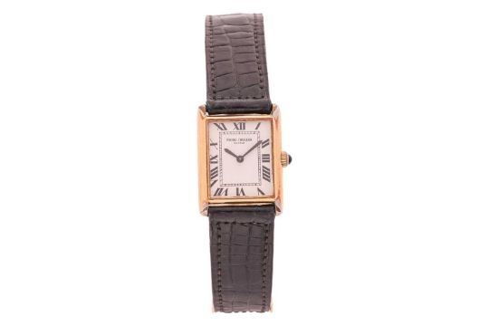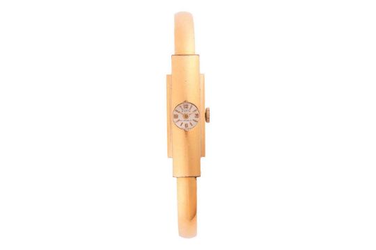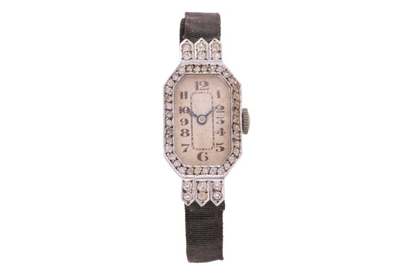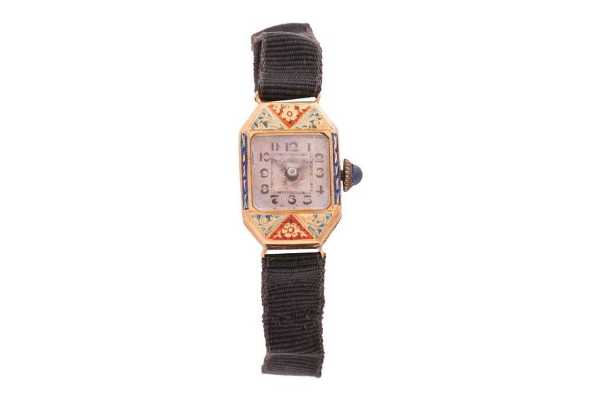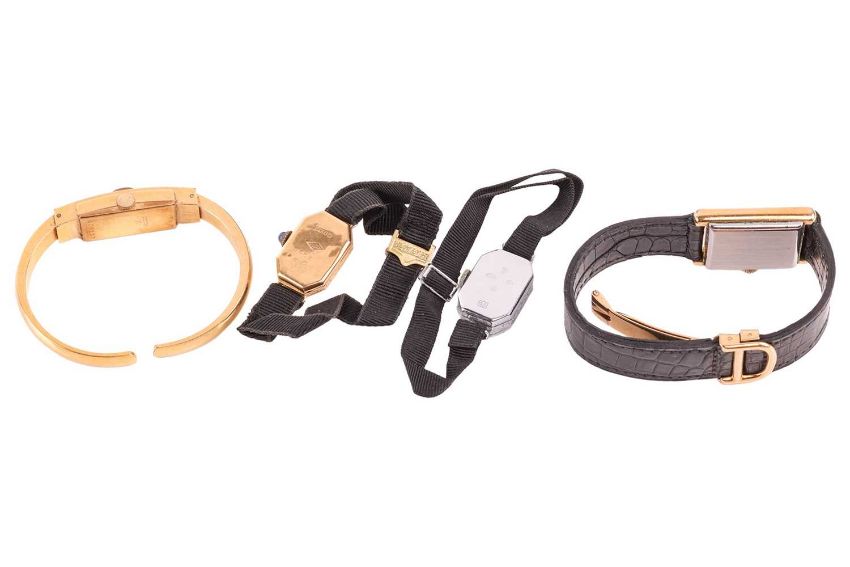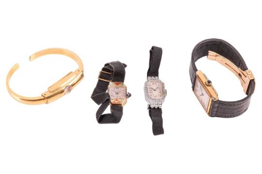 A group of four watches; the first an Astin gold-plated wristwatch, featuring a seventeen jewel manual wind movement in a 11mm case, the case back numbered ‘109137’; the second an 18ct yellow gold enamelled dress watch, featuring a manual wind movement in a 14mm case, the case back featuring an Edinburgh import mark dated 1925, marked ‘12066’, ‘18K’ and ‘M.W.L’, to a black fabric strap with a gold-plated buckle; the third a paste-set dress watch, featuring a manual wind movement in a 14mm case, the case back featuring London import marks for 925 silver, dated 1929, makers mark ‘GS’, to a black fabric strap with paste-set white metal buckle; the fourth a gold-plated wristwatch by Pierre L’Huillier, featuring a manual-wind movement in a 21mm gold-plated case, to a black leather strap with gold-plated fold-over clasp; Total weight of all items 73.7 grams (4).