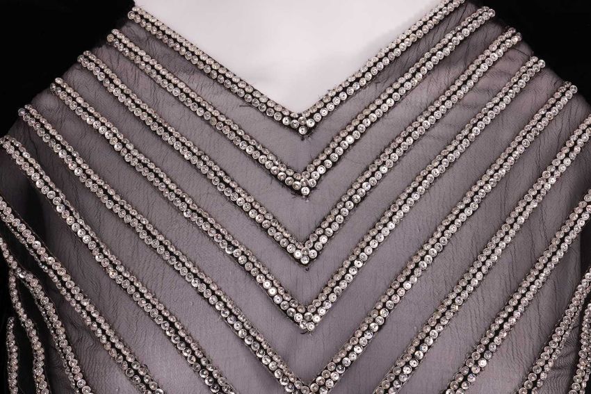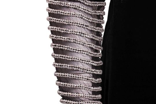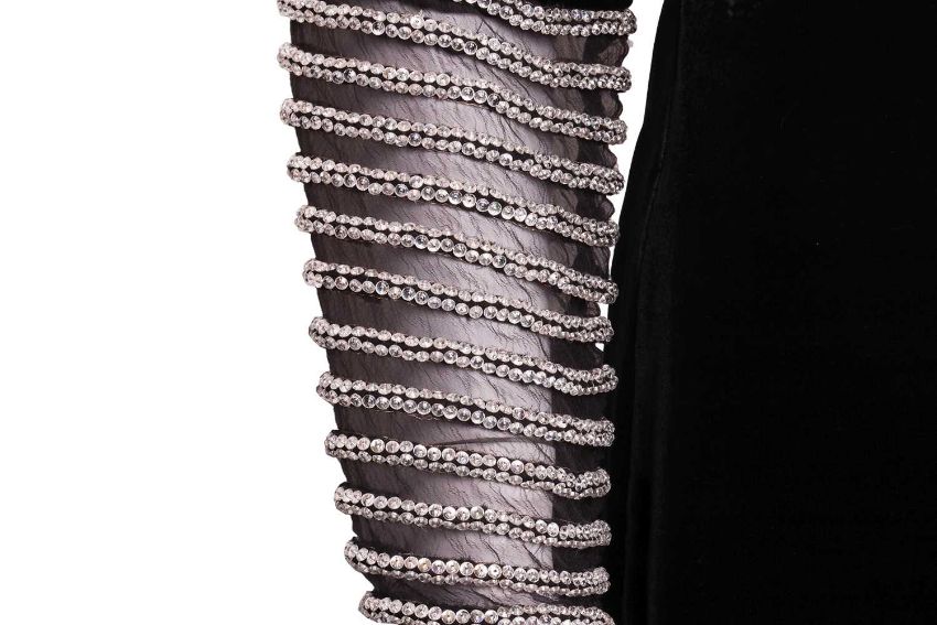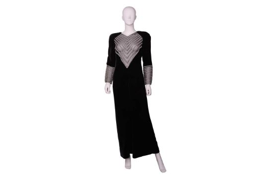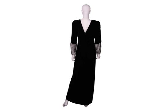 Valentino - a maxi evening gown in black velvet, circa 1980s, boutique label, with chiffon inserts to bodice and cuffs, embellished with bands of rhinestones, size 8.