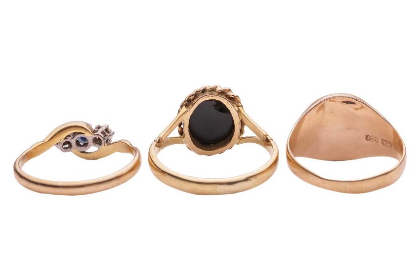 Three gem-set rings; comprising a collet-set opal ring, a quartz intaglio, partially deficient, and a sapphire and diamond three-stone ring, all stamped "18K", all ring size S, total weight 10.33 grams (3).