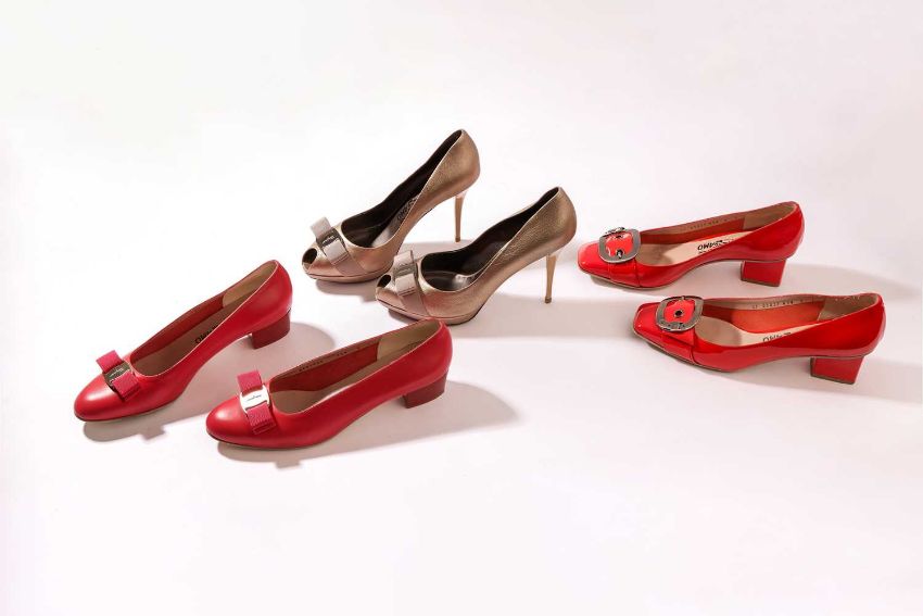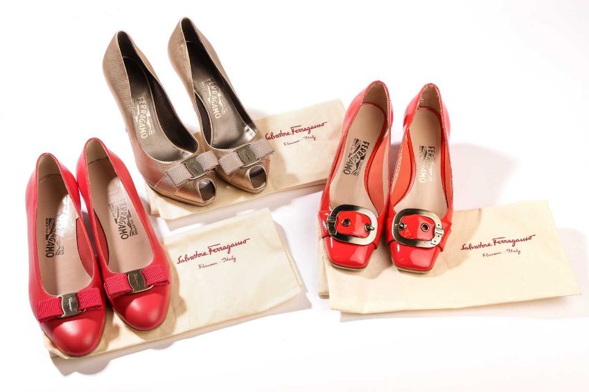 Salvatore Ferragamo - a pair of Vara bow peep-toe platform pumps in metallic beige leather (size 8); a pair of Vara bow motif heels in red calf leather (size 8); and a pair of Megan with garter buckle motif in orange red patent leather (size 8). (3)