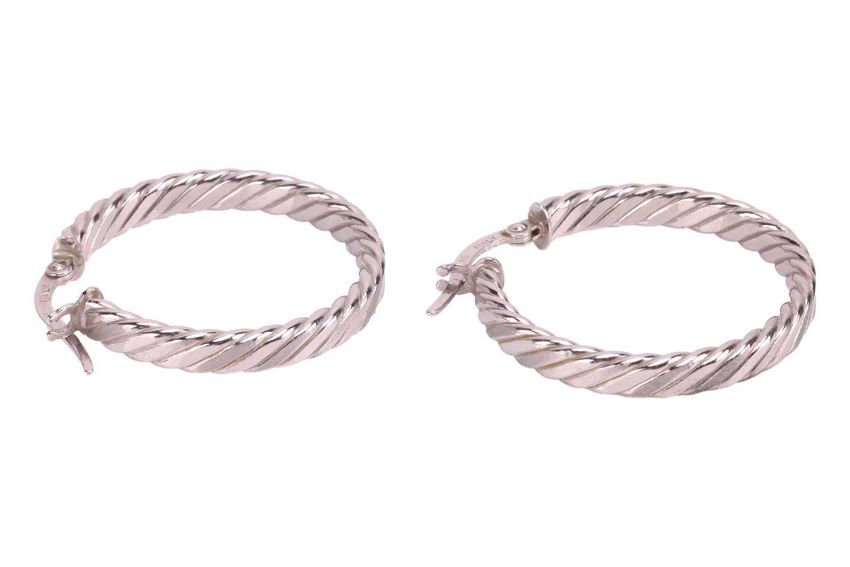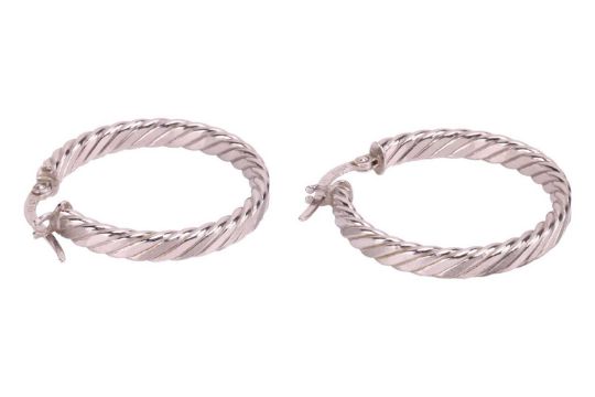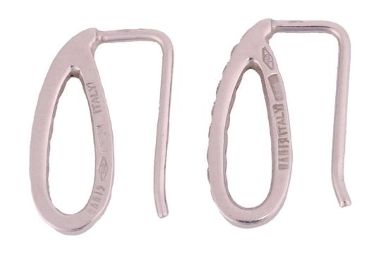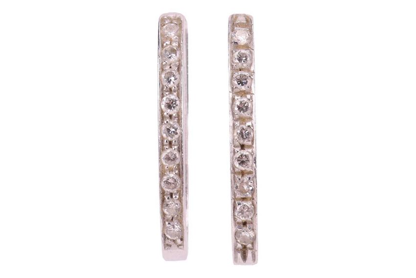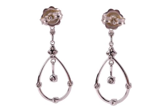 A group of white gold earrings; the first a pair of 9ct white gold hoop earrings of stylised textured rope design, with hinged fittings, the hoops each measuring 2.5cm in diameter; the second a pair of 18ct white gold diamond-set drop earrings of pear form, the drop featuring three claw-set diamonds with a central articulated diamond drop, to stylised diamond-set quatrefoil surmounts and a diamond-set post, post fittings with butterfly backs, length of drop 3.2cm; the third a pair of diamond-set drop earrings, with a side profile of teardrop form, pave set with nine brilliant-cut stones, drop length 1.5cm; Gross weight 7.0 grams (3).