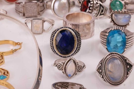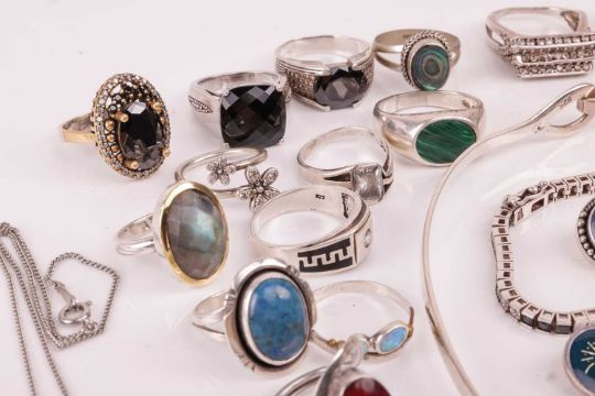 A quantity of silver and bi-colour metal jewellery items, the majority marked '925', comprising a necklace, line bracelet, a large group of rings, many gem-set, and other items; 325.5 grams