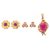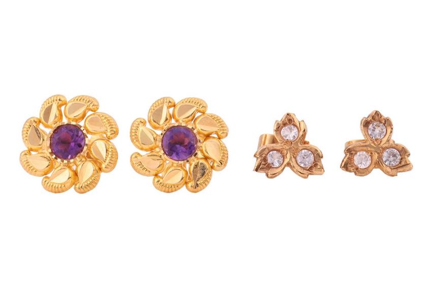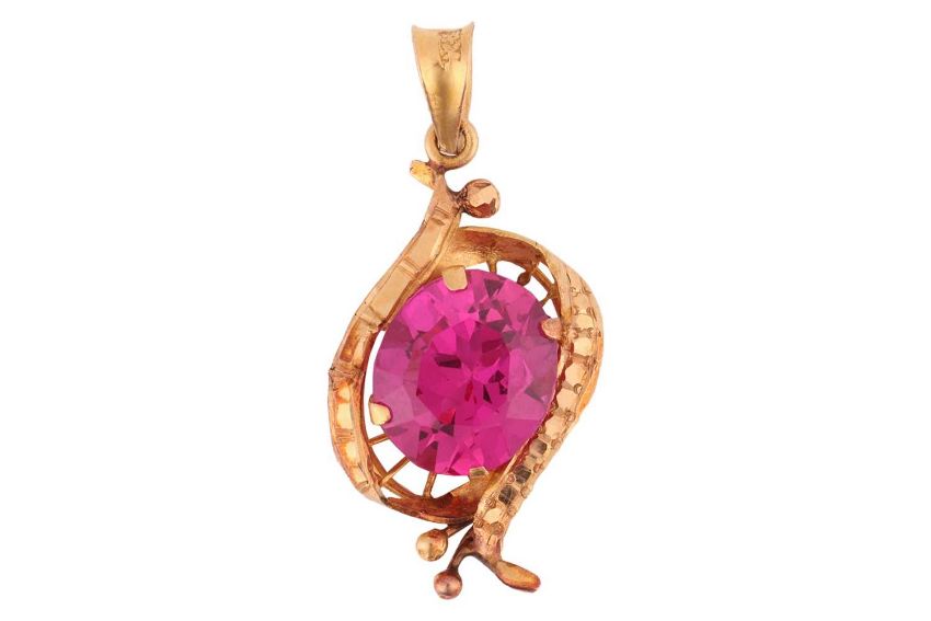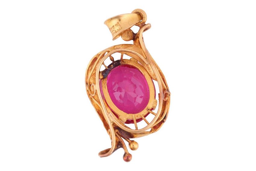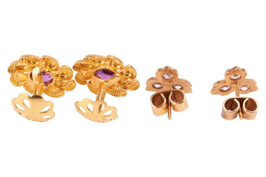 A pendant and two pairs of earrings; the pendant set with an oval-cut synthetic ruby, in yellow metal marked 'Emas Paun' (Malaysian 800 fineness), 2.7 grams; a pair of floral earrings set with amethysts, in yellow metal marked '916', 3.2 grams; and a pair of trefoil earrings set with paste, in mount testing as 18ct, and peg fittings testing as 14ct, 2.3 grams. (3)