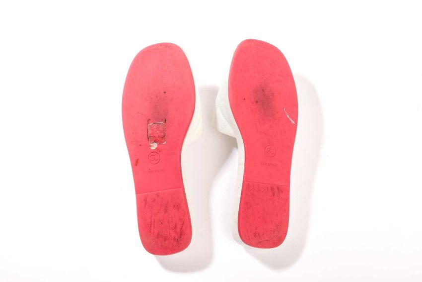 Chanel - a pair of CC Cambon flat slides in white quilted leather. (size not sure, 39.5/40)