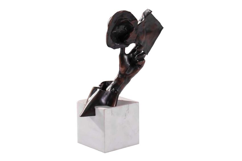 Péter Párkányi Raab (b.1967) Hungarian, 'The Letter', abstract patinated bronze on a square white marble base, 37.5 cm high.