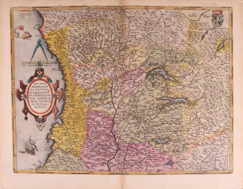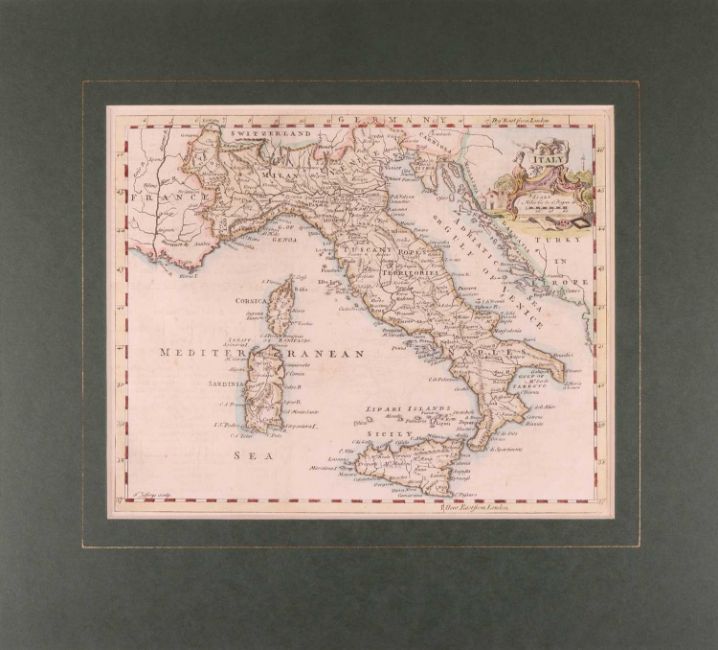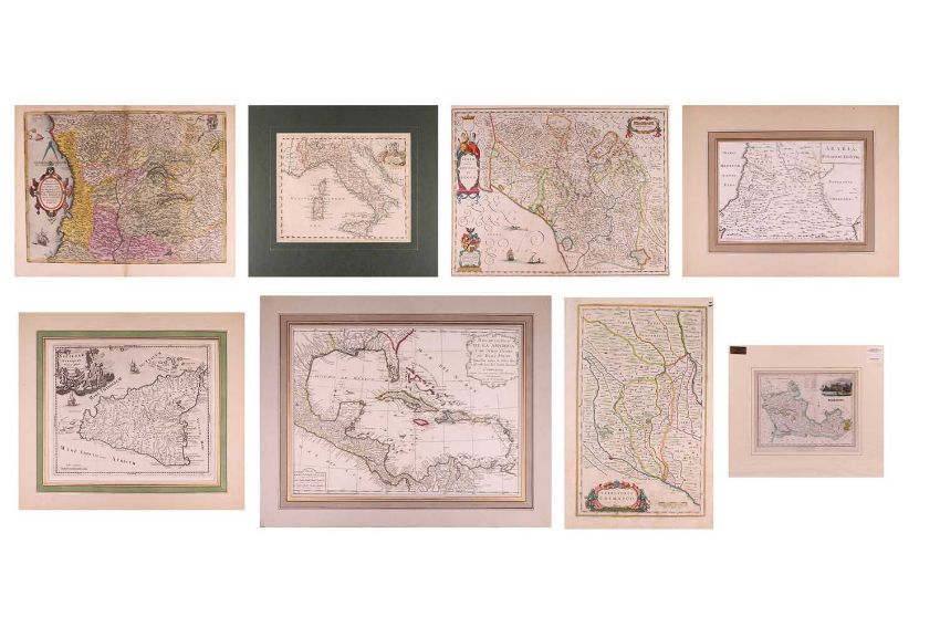 Abraham Ortelius, Ducatus Mediolanensis Finitimarumo..., hand coloured engraving with arms (top right), text in French verso for Le Duche de Milan, sheet 41 x 53 cm, plate 36 x 48 cm; Guillaume and Jean Blaeu, Stato Della Republica di Lucca, hand coloured engraving with coat of arms (lower left), sheet 39.5 x 50 cm, plate 38.5 x 50 cm; Territorio Cremesco, hand coloured engraving with fruit cartouche, sheet 42 x 27.5 cm, plate 38.5 x 24 cm; Philip Luverio, Siciliae Antiquae Descriptio, enggaving with Bacchus cartouche, sheet 30 x 37.5 cm, plate 27 x 32.5 cm. mounted 40 x 46 cm; William Henry Toms, Arabia Petraea et Deserta, engraving, 25.5 x 39 cm, plate 21 x 31 cm, mounted 35 x 44 cm; Jean Baptist Anville, Mapa de La America y de Otros Paises de Tiera Frime, hand coloured engraving with scroll cartouche, sheet 36.5 x 50.5 cm, plate 32.5 x 46 cm, mounted 43 x 54 cm; an English late 18th century map of Italy, hand coloured engraving, 19 x 23 cm and a Robert Scott map of Berkshire, depicting Windsor Castle, 19 x 24.5 cm (both mounted)