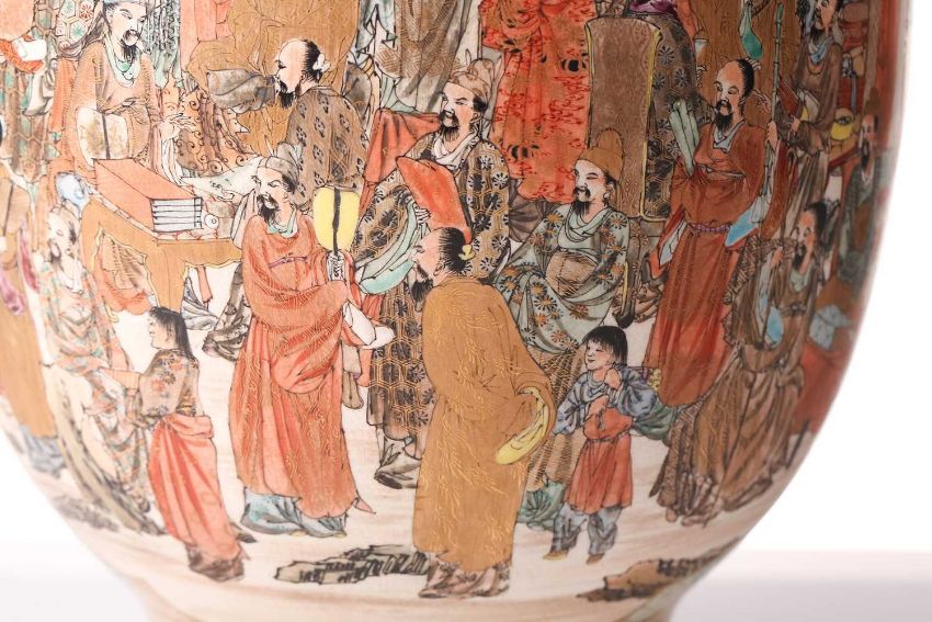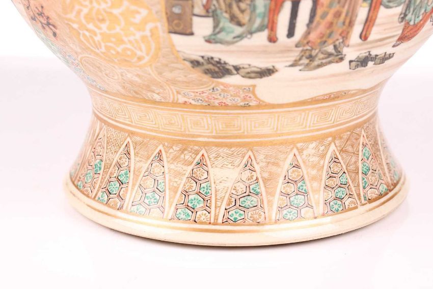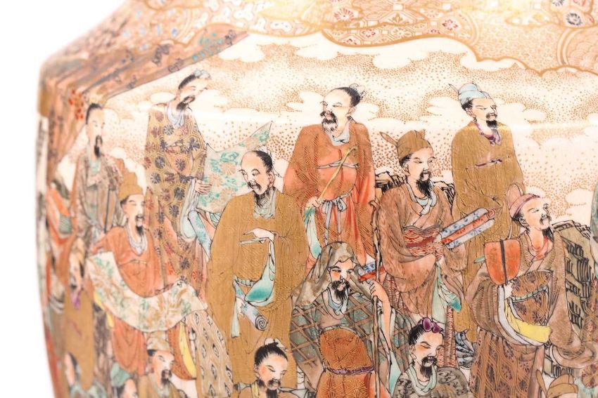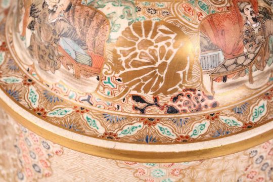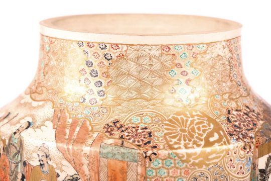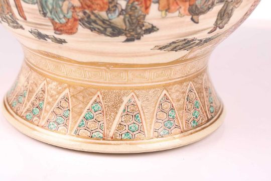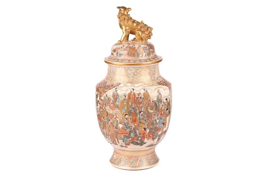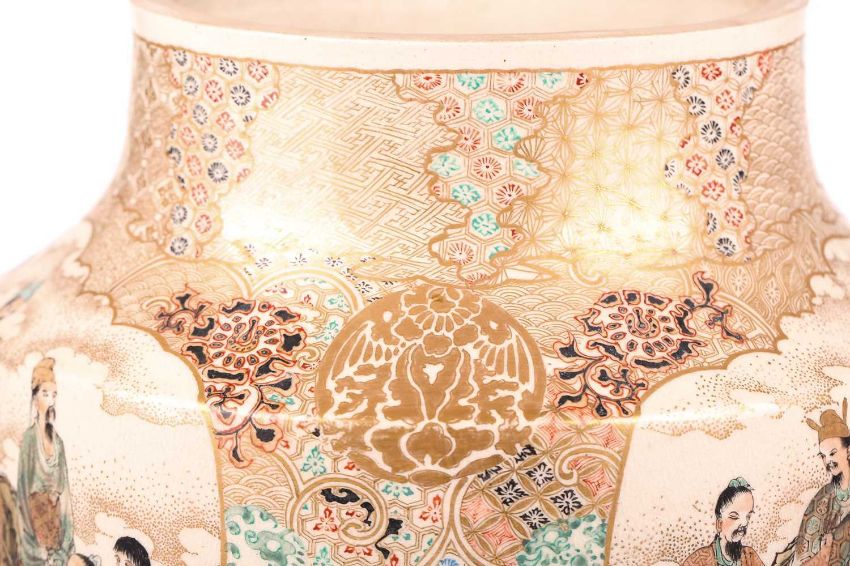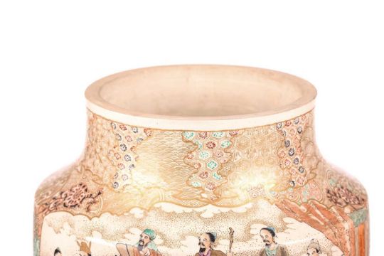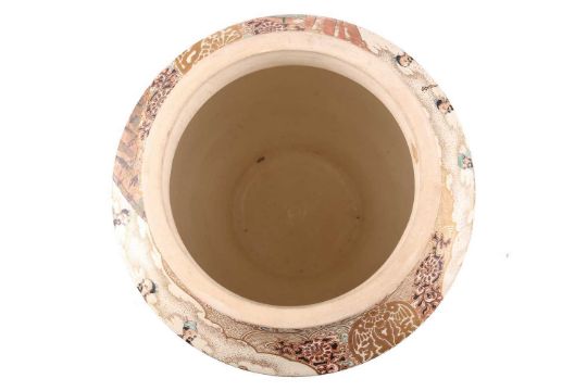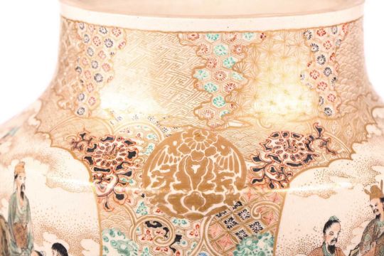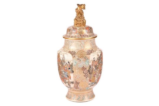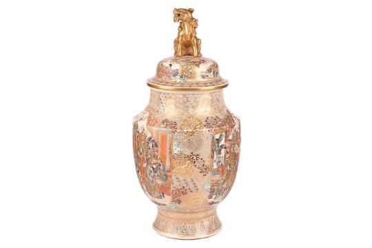 A Japanese Satsuma pottery baluster vase and cover, Meiji period, late 19th century, the cover with bold seated gilt lion dog finial painted with "a thousand faces" depicting numerous similar scholars and officials heightened in gilt and painted in colours within cellular and Mon borders, unmarked 50 cm high