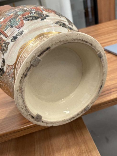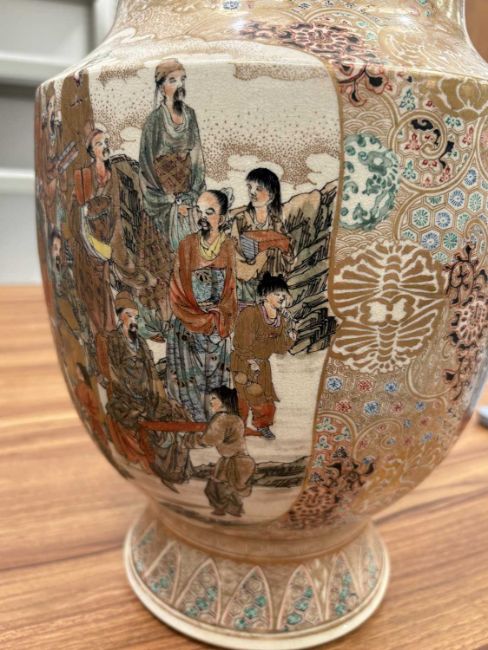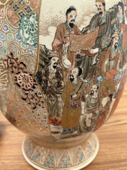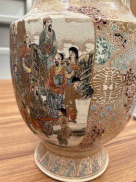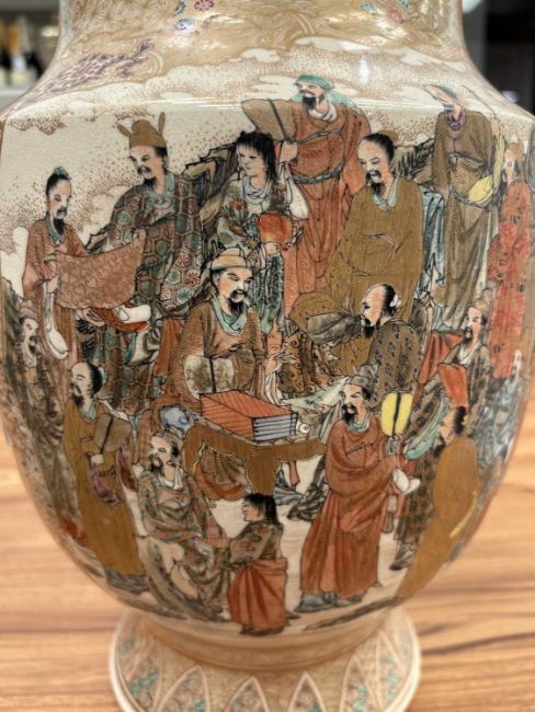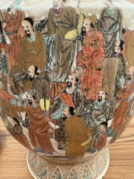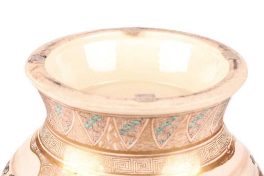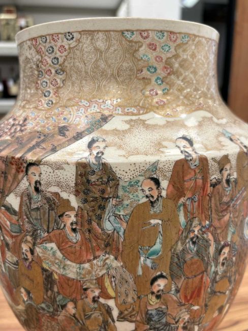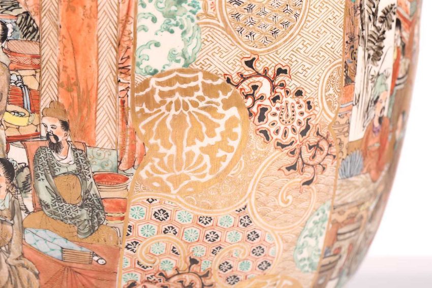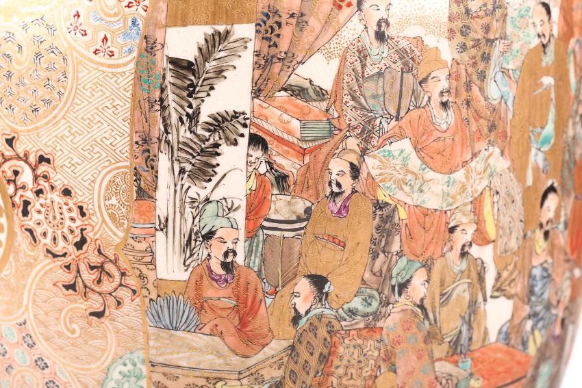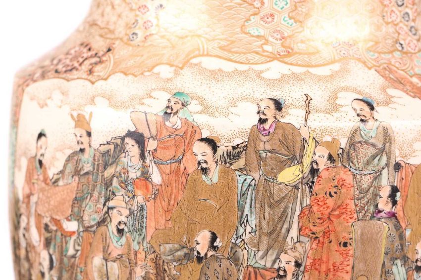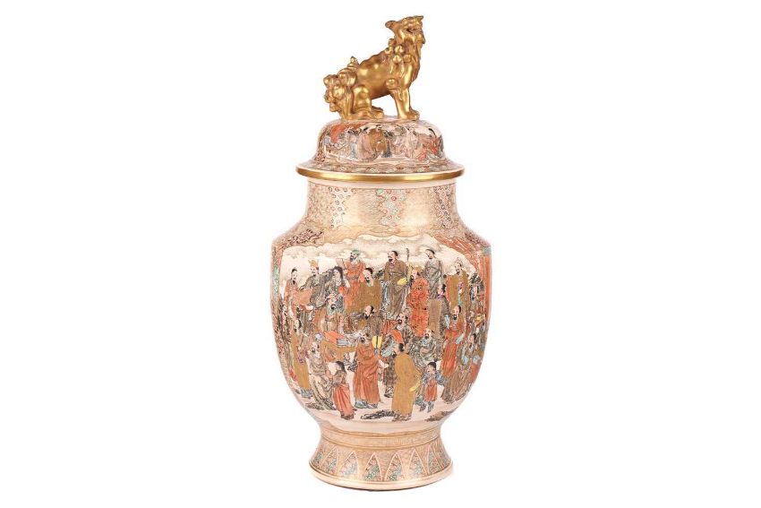A Japanese Satsuma pottery baluster vase and cover, Meiji period, late 19th century, the cover with bold seated gilt lion dog finial painted with "a thousand faces" depicting numerous similar scholars and officials heightened in gilt and painted in colours within cellular and Mon borders, unmarked 50 cm high