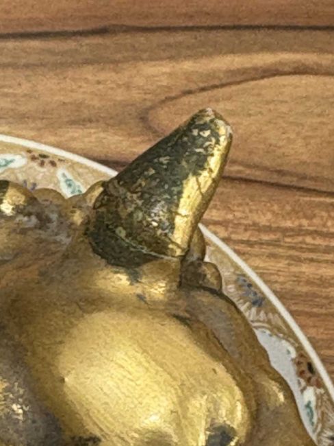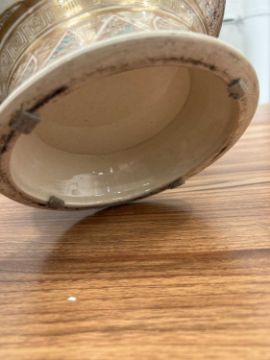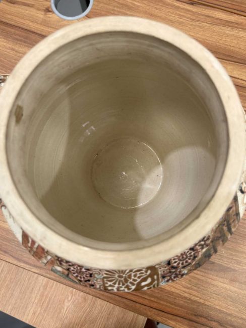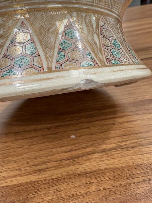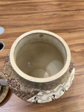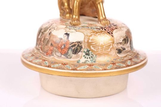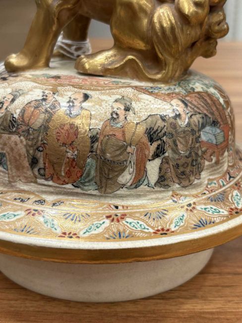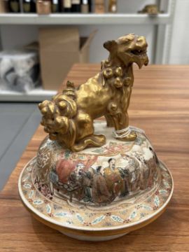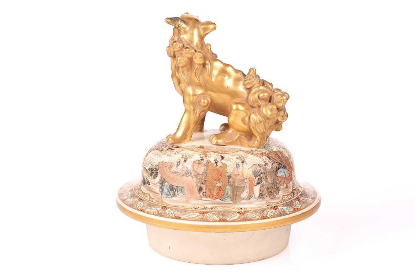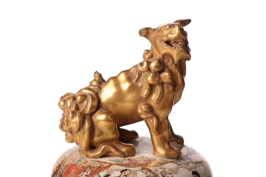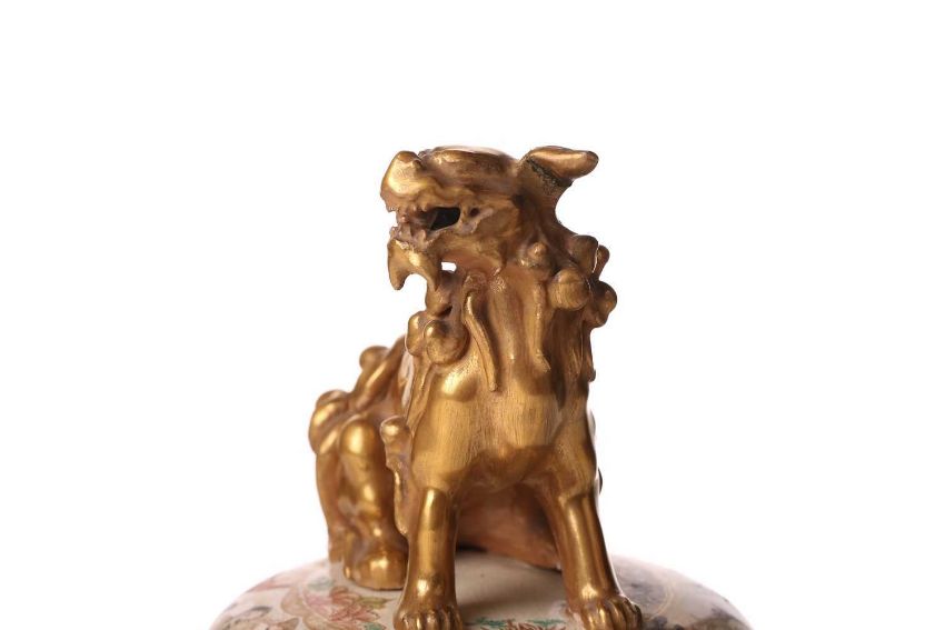 Losses and repair to the lion dog finial, as shown. Small chip to the footrim. Crazing visible throughout, with some possible colour bleaching and there is some rubbong and loss to the gilt highlights. No major cracks or repair evident to the body.