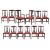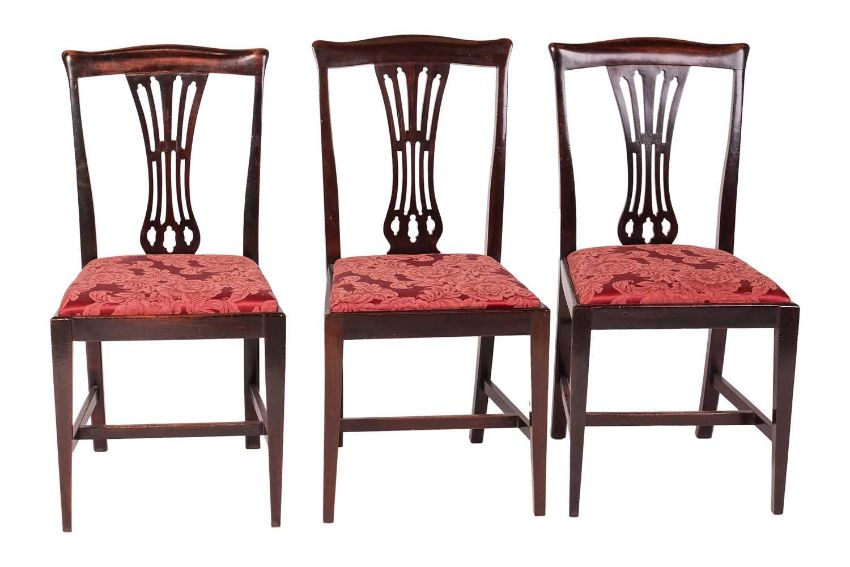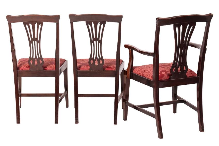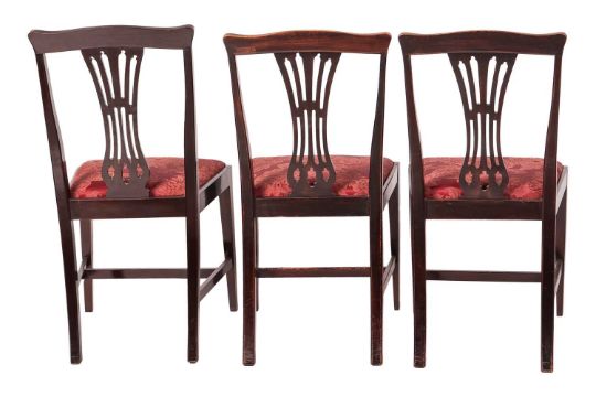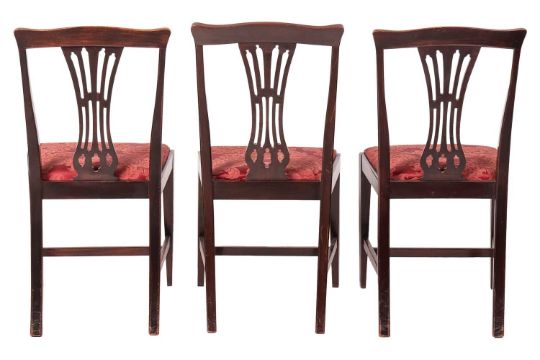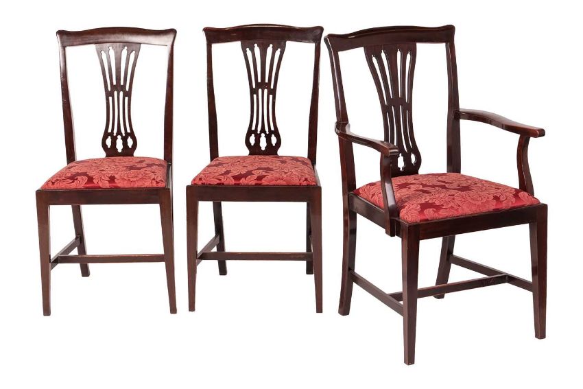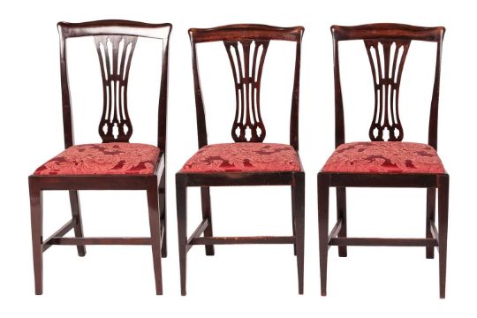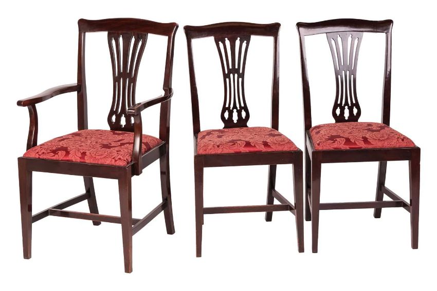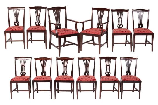A set of twelve mahogany dining chairs in the Chippendale manner, c.1900, comprising Pair of Armchairs and Ten Side Chairs, with shaped top rails, pierced splat backs, drop-in red damask upholstered seats, raised on square tapered supports joined by stretchers 57 cm wide x 60 cm deep x 97 cm overall height, 47 height to the seat.