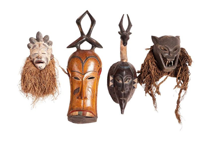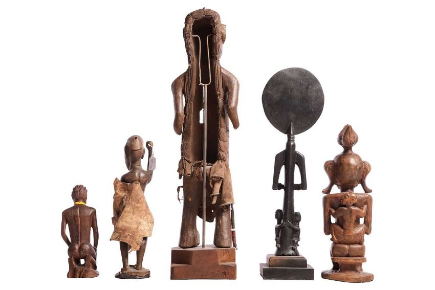Six various African Tribal carvings including a Luba Witch Doctor figure, 47 cm high, and two Ivory Coast Guro masks