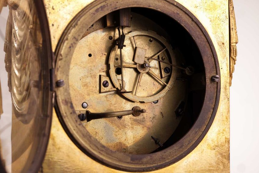 No pendulum or key present. Some spotting and losses to the gilding. Cracked glass to rear, no cover to clock face.