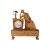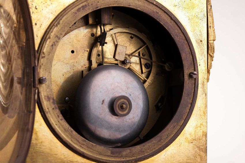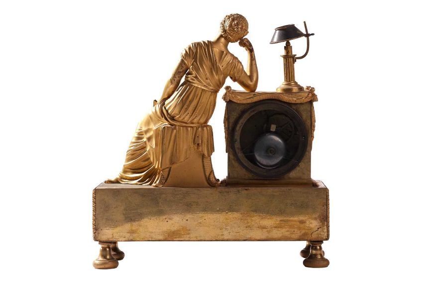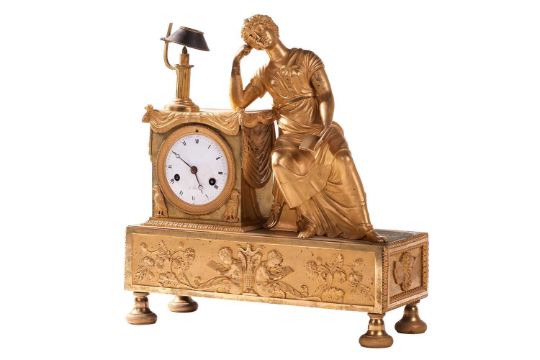 A French Empire ormolu mantel clock, circa 1820, with the seated figure of Calliope beside a lampe bouillotte on drapery, over a circular enamel dial, the base with fireze decoration, on four feet, 38 cm x 34 cm x 13 cm.