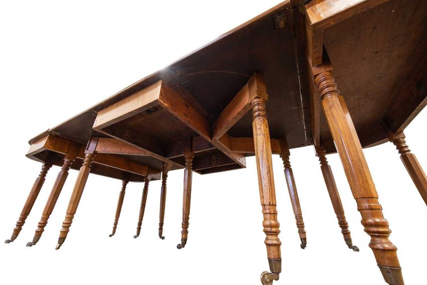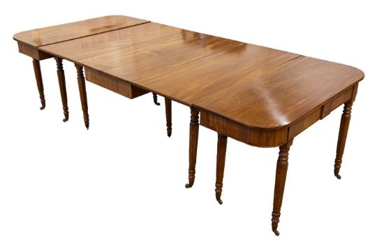 A late George III mahogany D-end dining table with, comprising two "D" ends and a central five legged drop leaf section with cross grian frieze and octagonal section tapering legs terminating in brass socket castors. 262 cm overall length x 119 cm deep x 75 cm overall height, 61 cm knee height.