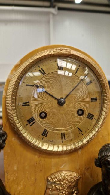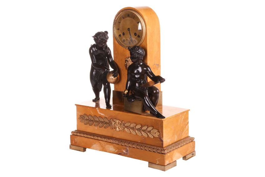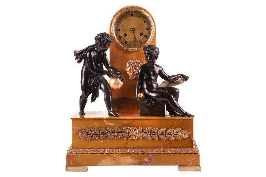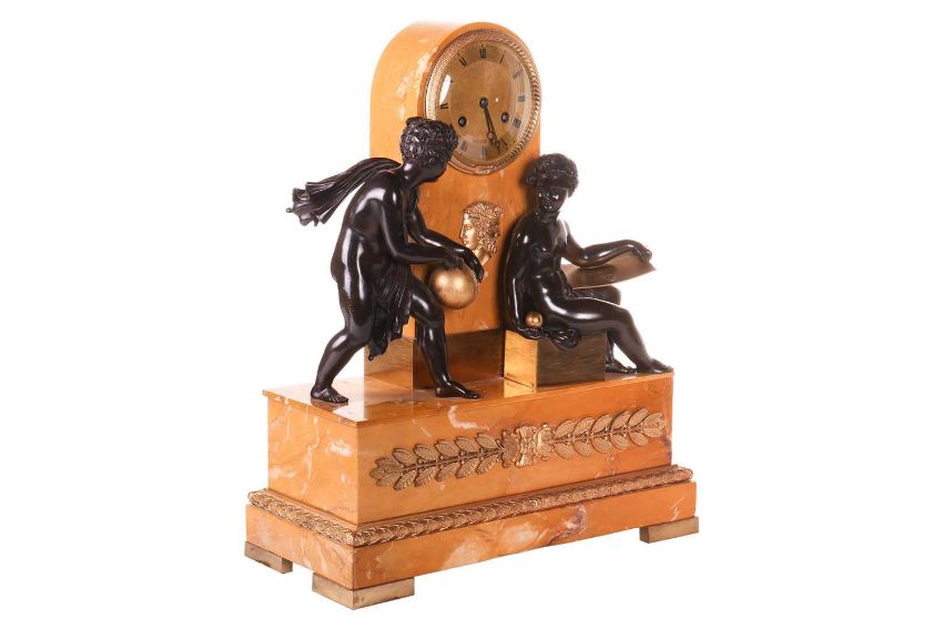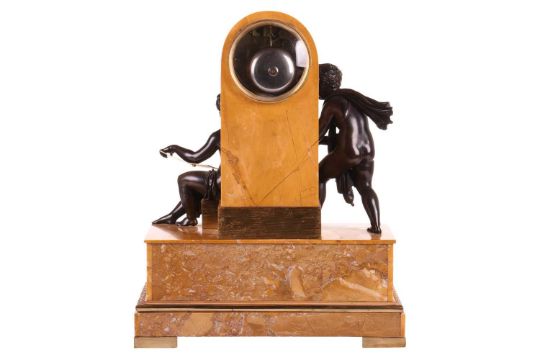 A French Empire bronze, sienna marble and ormolu mounted mantel clock, the gilt dial inscribed Cailliaud in an arched marble case with twin faced mask, over two Classical figures studying astronomy above an ormolu mounted marble base with square feet, the French twin train movement with silk suspension and count wheel striking on a bell, 47 cm high, 38 cm wide