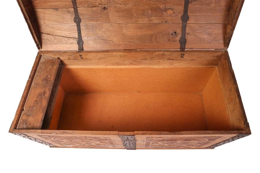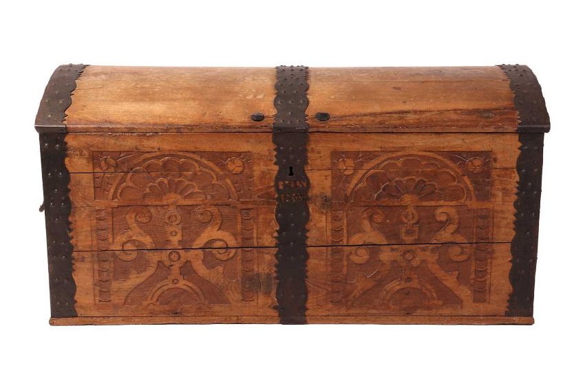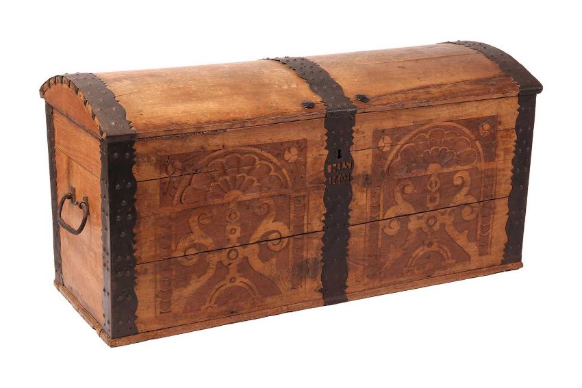 A Northern European century iron bound dome topped coffer, dated 1803 and monogramed, HIS, the frieze panel with simple carved decoration, 164 cm long x 64 cm deep x 72 cm overall height.