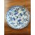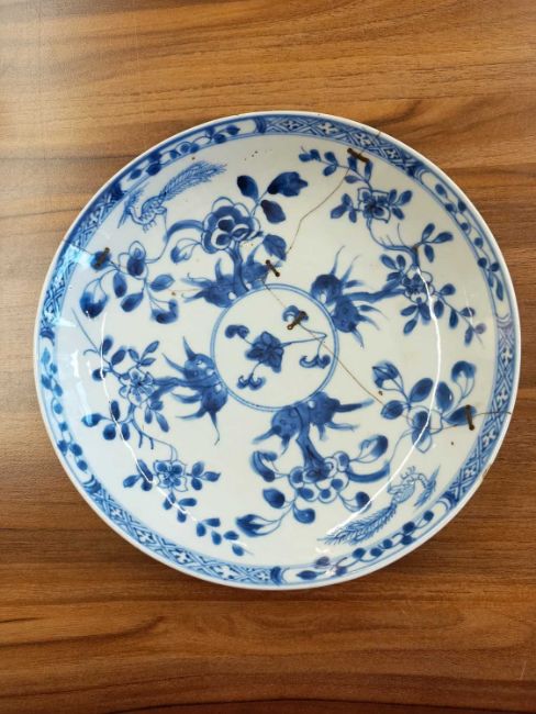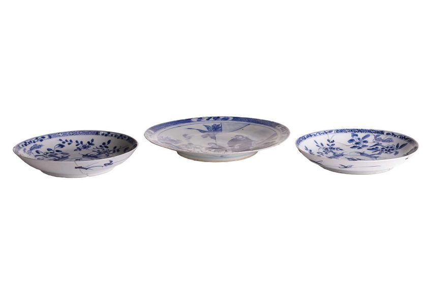 A Chinese blue and white circular charger, Qing Dynasty,19th century, painted with a lady kneeling before a smoking censer regarded by a court official, with a diaper and floral border. 28 cm diameter and a pair of 18th-century Chinese blue and white saucer dishes (rivetted).