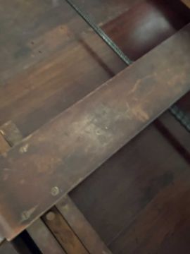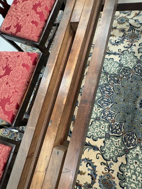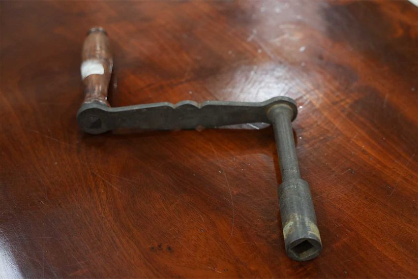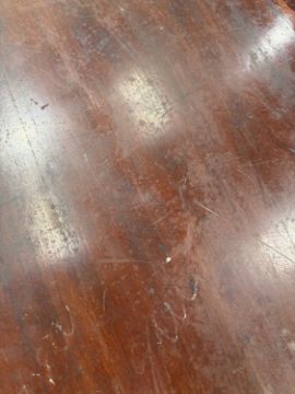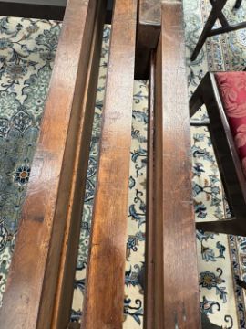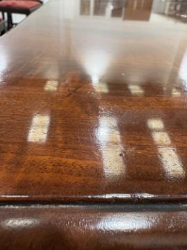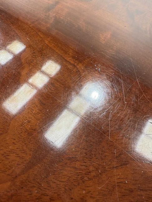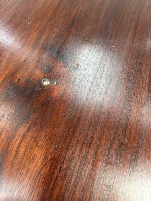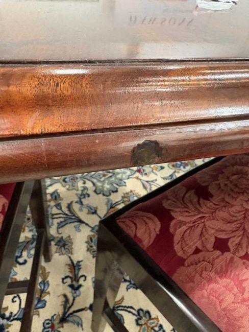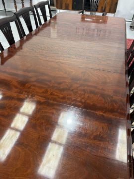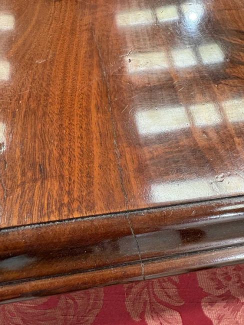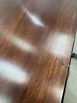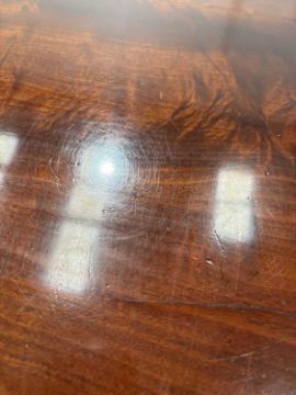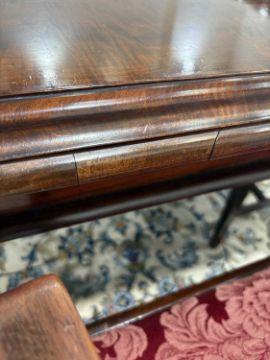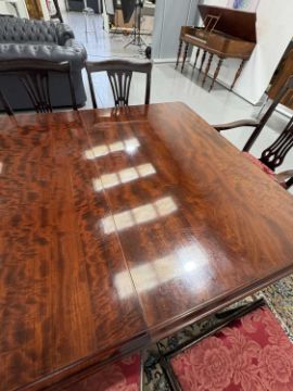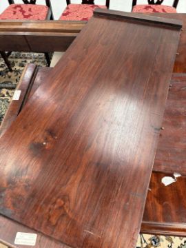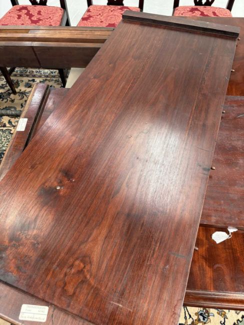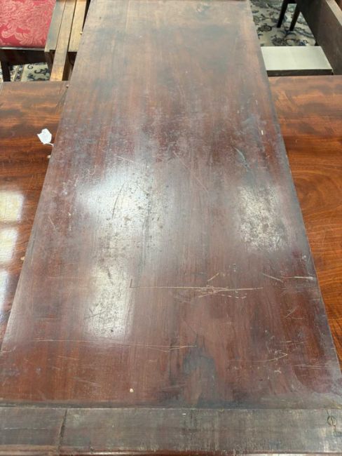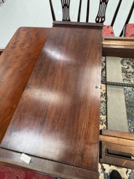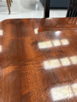 In good overall condition, with no major issues evident. It is veneered, with some small bits of wear and damage visible to the edges (as shown), but they are commensurate with age and use. Light surface scratches to the top, throughout, again commenusurate with use. The table is very solid, and the winding mechanism works well. No major movement in the table, when all leaves are in place.