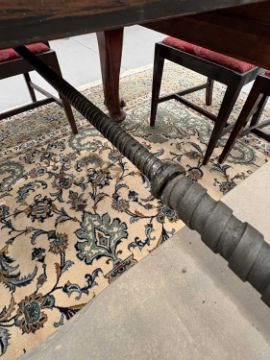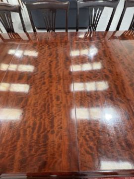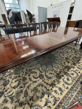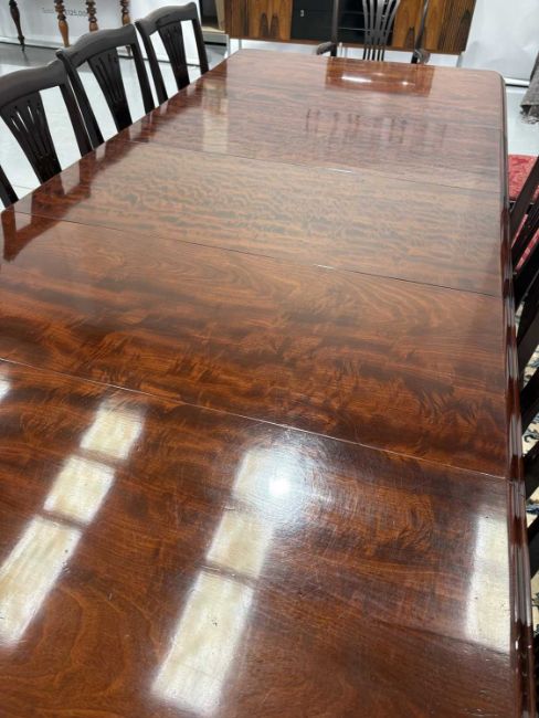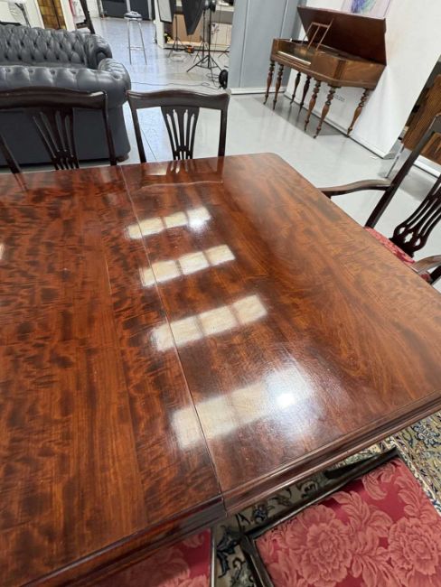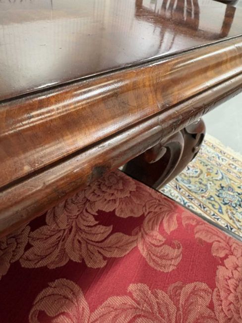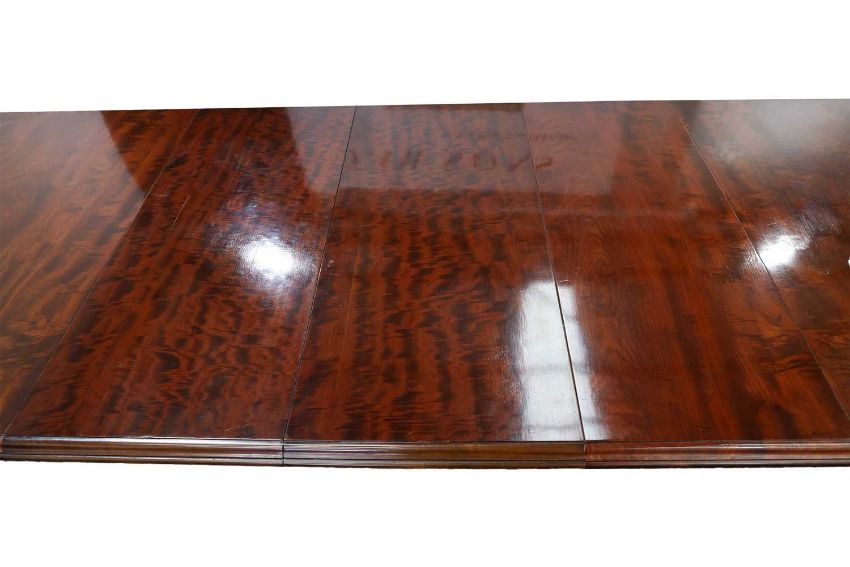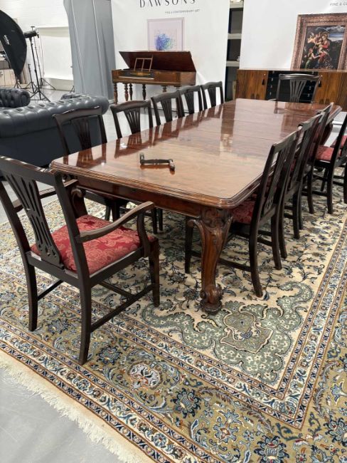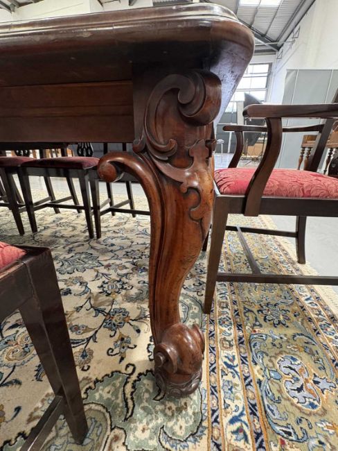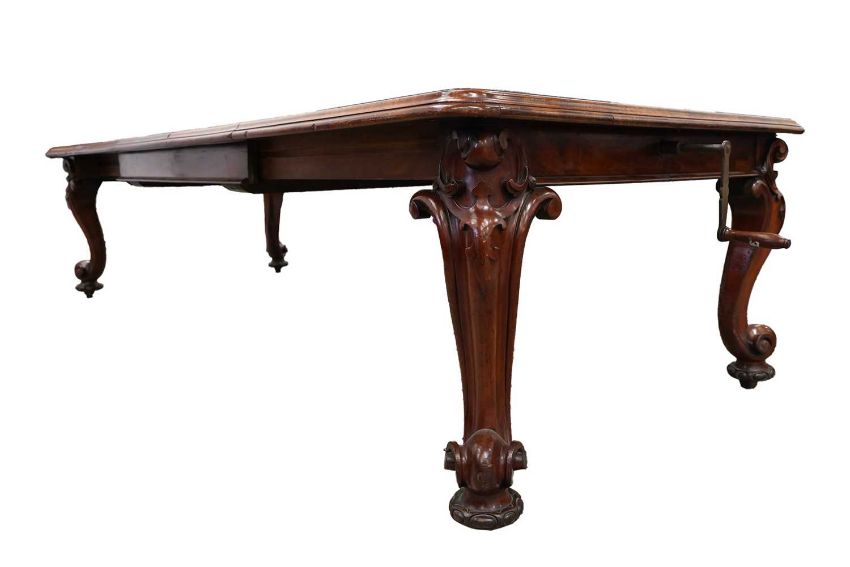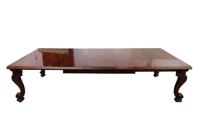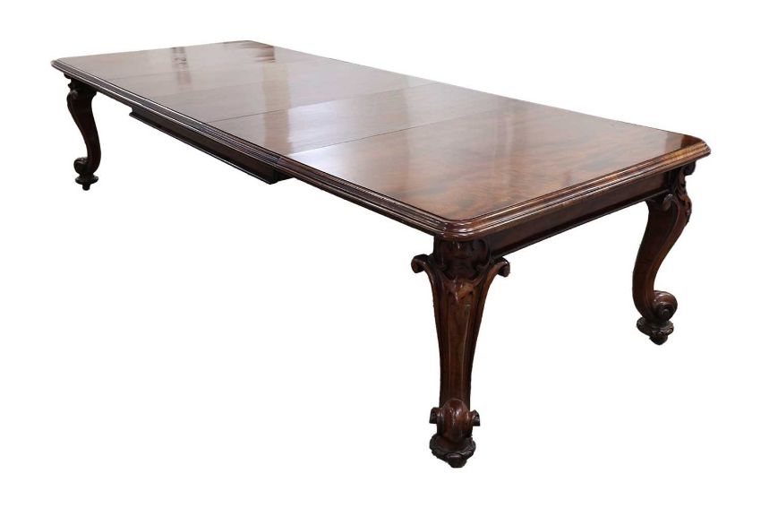 A fine Victorian figured 'Fiddle' mahogany extending dining table c.1860, with moulded top and winding mechanism extending to incorporate three additional leaves, raised on four heavy scroll carved cabriole legs and parchment scroll feet, 298 cm long x 120 cm deep x 74 cm overall height, 57 cm knee height.