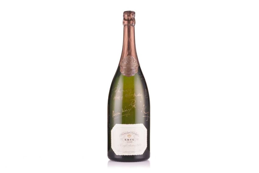 A magnum of 1969 Krug Collection Champagne, with original wood case and paperwork, 150cl, with birthday inscription written to the body.