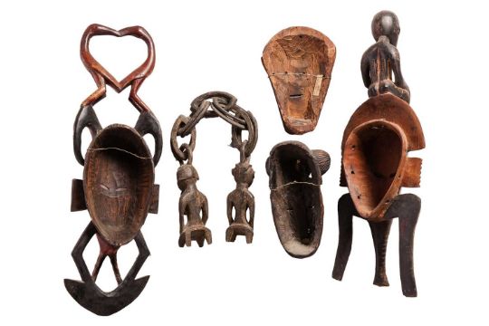Five African masks, and carvings, Ivory Coast Guro and others.
