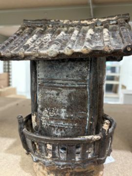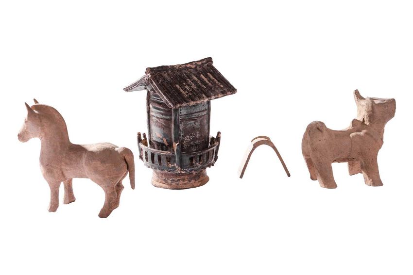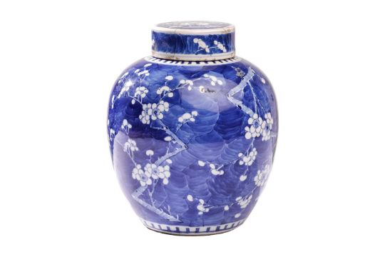 A large Chinese prunus ginger jar and cover, 26 cm high, four character mark to base, together with two Tang Dynasty style figures, and a Chinese stoneware hut, 27 cm high.
