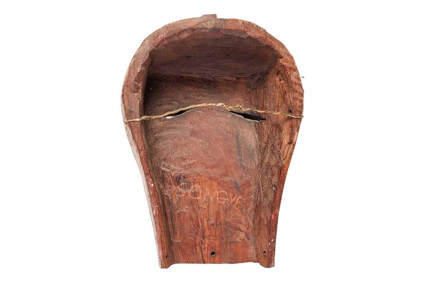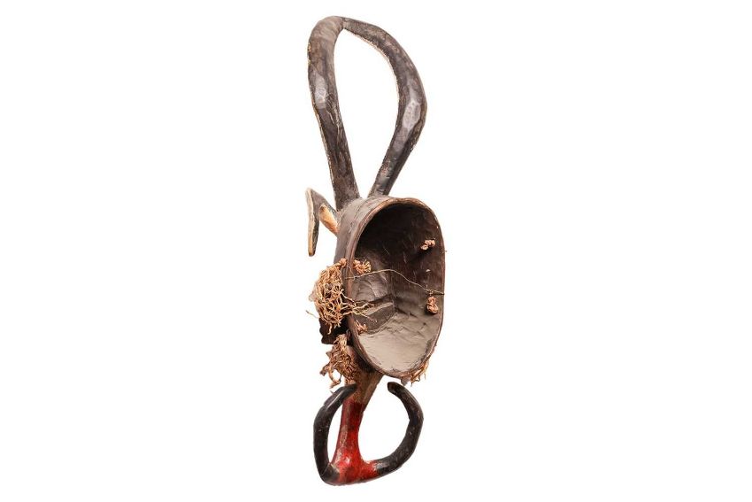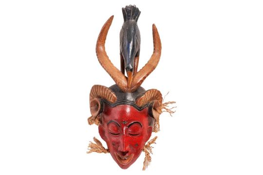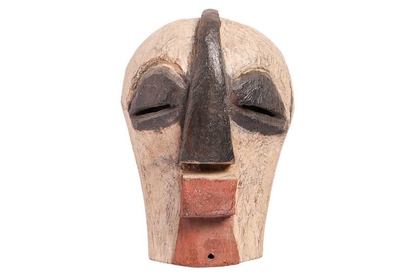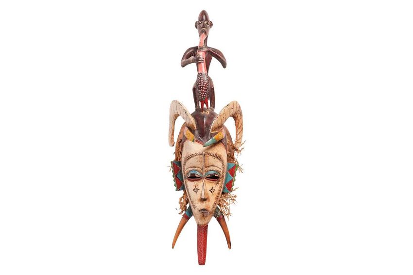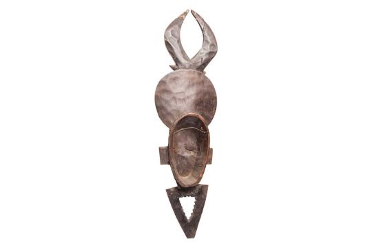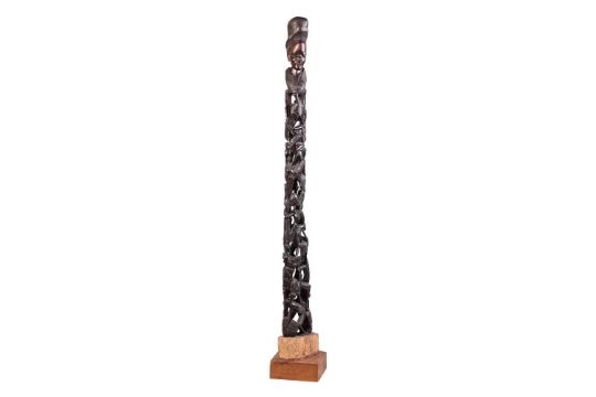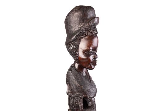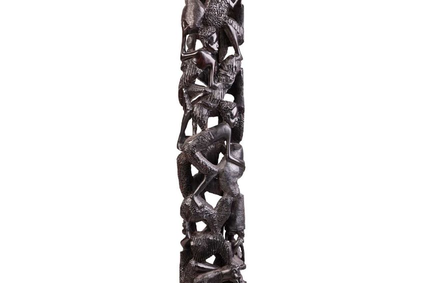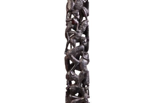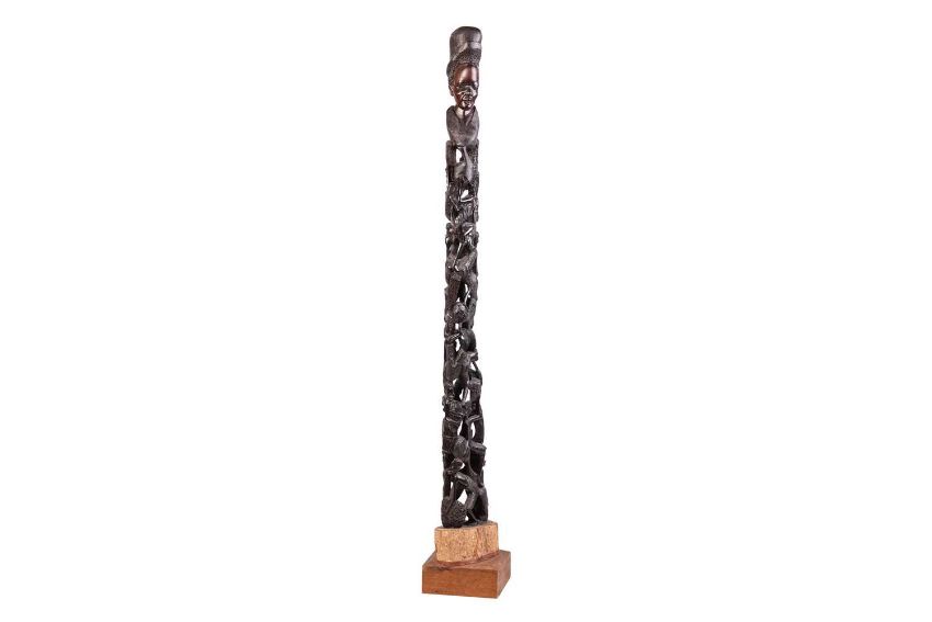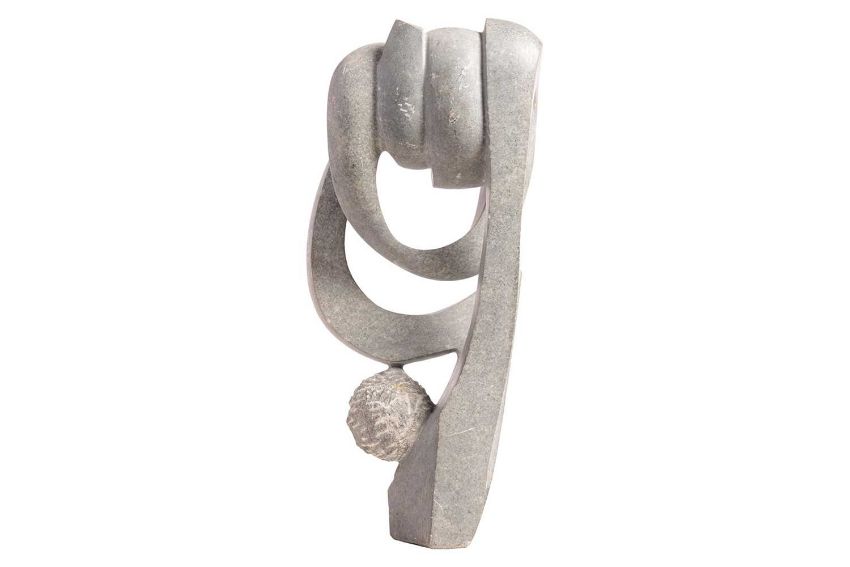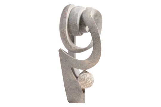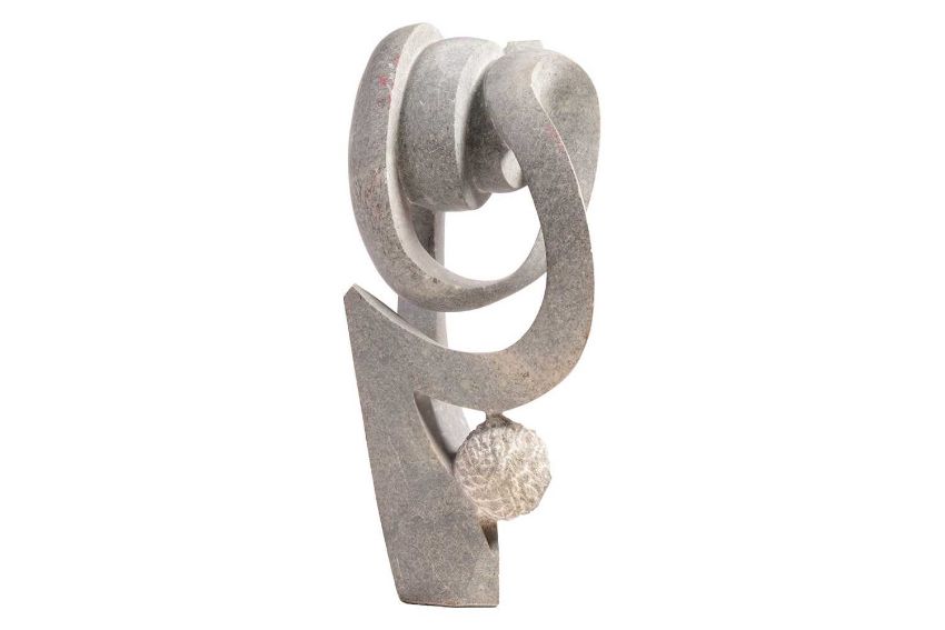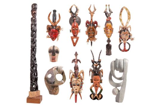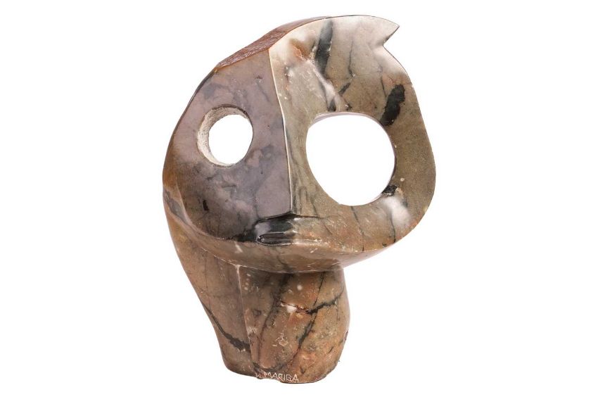 Collection of African tribal carvings, Songye, Namibian, and Zimbabwe, and two hardstone carved sculptures, including a large soapstone abstract work signed W. Mariga (Walter Mariga). 36 cm wide x 40 cm high.