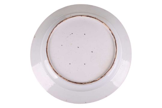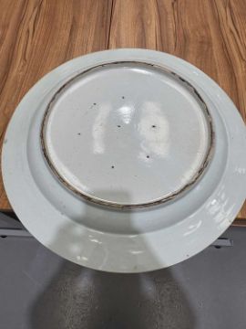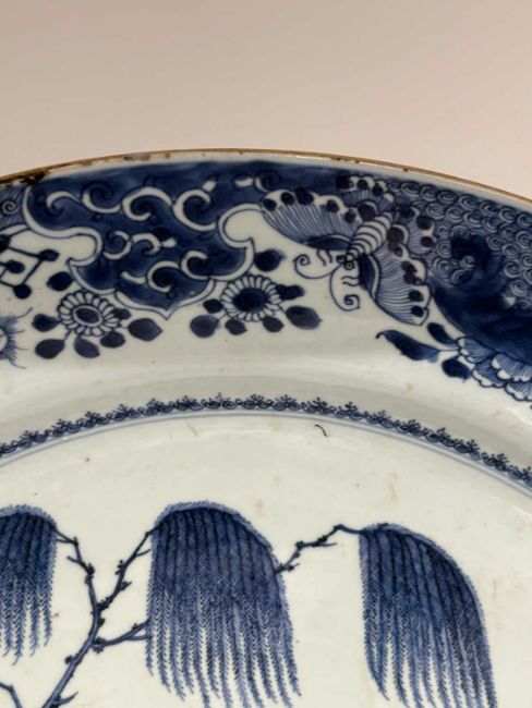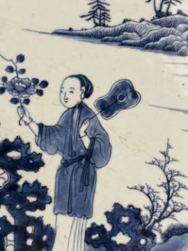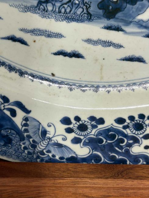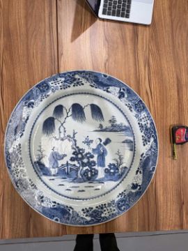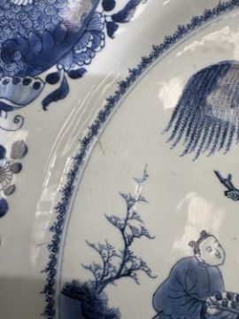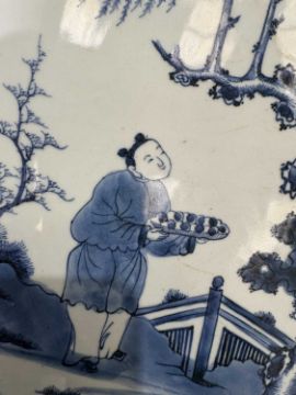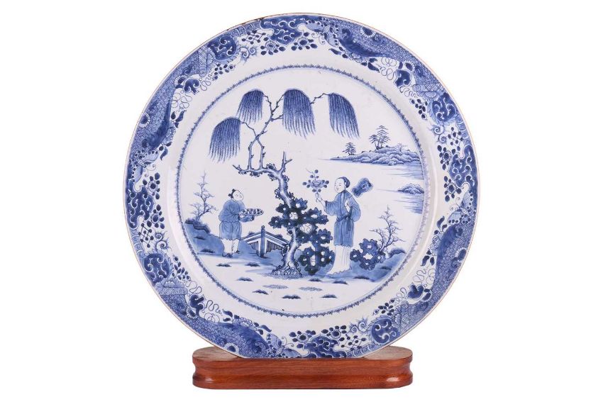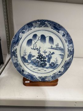 A very large Chinese blue and white porcelain charger on stand, late 18th/early 19th century, depicting figures in a landscape, 55 cm diameter.