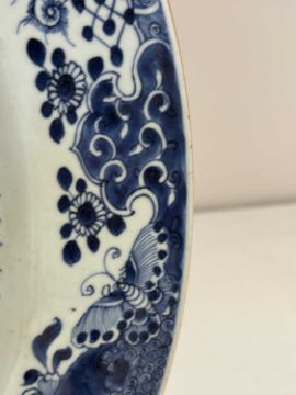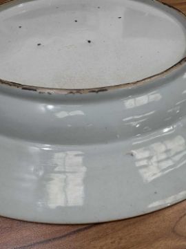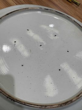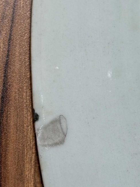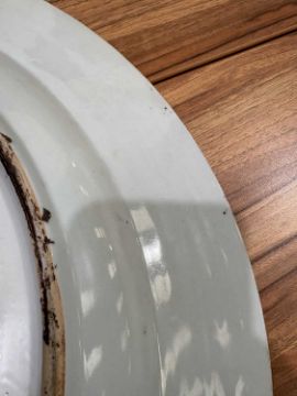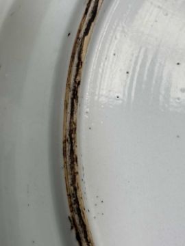 Chip to inderside of rim, but no major damage evident. Surface pitting and spots in places, with small firing faults also visible. Wear to rim, with some glaze loss.
