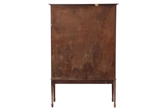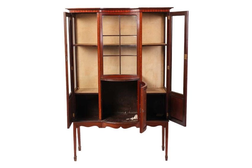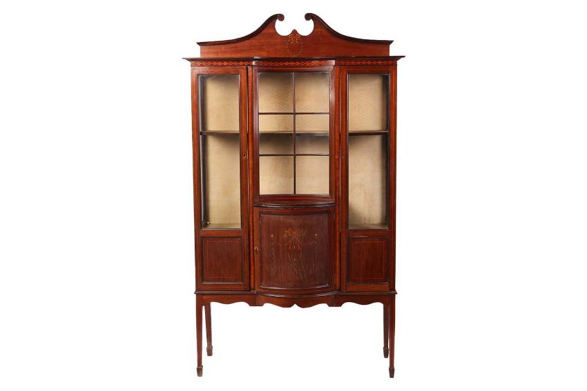 An Edwardian mahogany stepped bowfront and classical marquetry display cabinet, 193cm high x 113cm wide.
