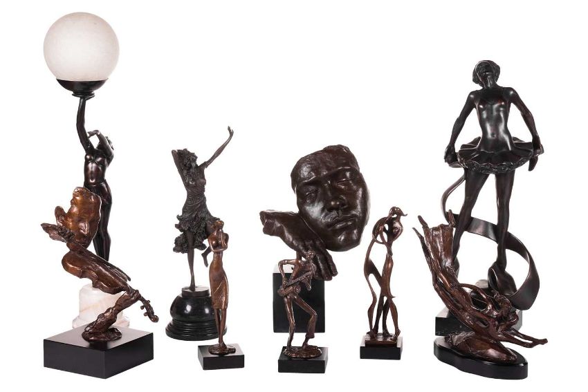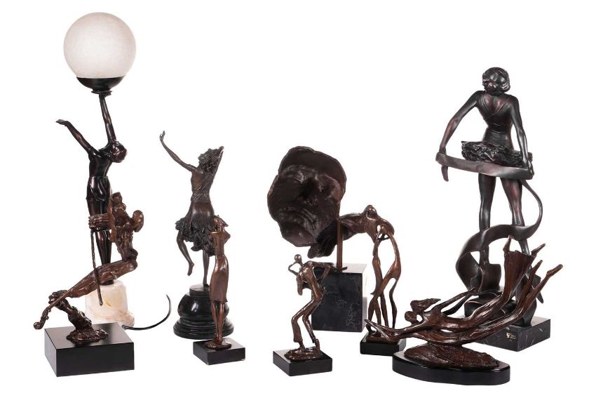 After Claire-Jeanne-Robert Colinet (1880-1950), a patinated bronze figure of a dancer, late 20th century, on a cylindrical polished slate base, French foundry mark, 43.5m high, together with eight futher modern decorative bronze and bronzed metal figures, some in the abstract, to inlcude an Art Deco style table lamp, a Modernist 'Dreaming Face' bronze sculpture, and others.