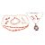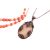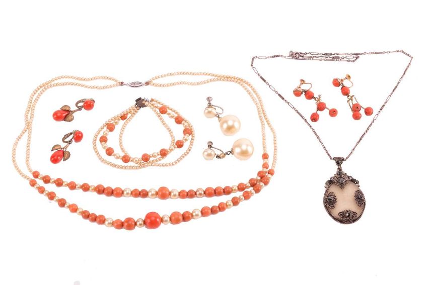 A group of jewellery, to include; a pendant necklace featuring an oval cabochon of frosted glass, set within a filigree mount of unmarked white metal, set with black pastes, to a bail and fancy link chain; a pair of coral drop earrings, with foliate design in gilt metal fittings; another pair of coral drop earrings, set in unmarked yellow and pink metal, with later added fittings, testing as 9ct, 5.9 grams; a double row, simulated pearl and coral bead necklace, with a fish-hook clasp in unmarked white metal; together with a bracelet of similar design, with a white metal sliding tongue clasp stamped 'sterling', and a pair of simulated pearl earrings with base metal fittings; Total weight 74.6 grams (6).
