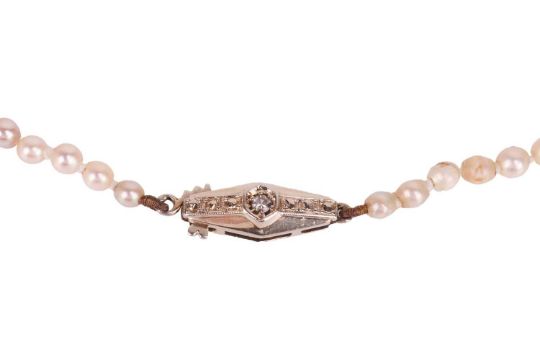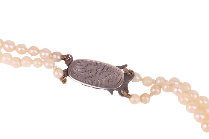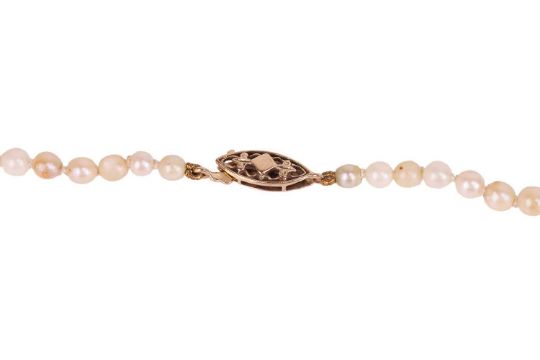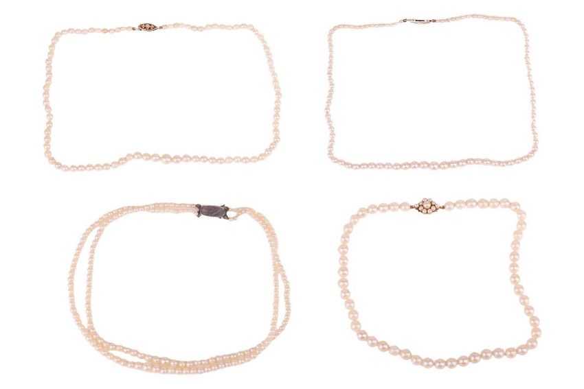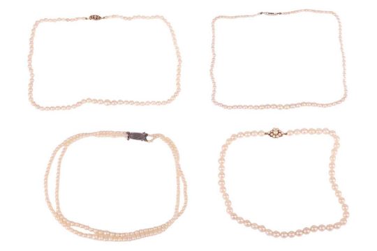 Four cultured pearl necklaces; including two graduated single-row pearl necklaces, one with a 9ct gold clasp and the other in metal stamped '585'; a double-row graduated necklace with fish hook clasp marked 'sterling silver'; and a single-row pearl necklace with a pearl cluster clasp in 9ct gold. (4)