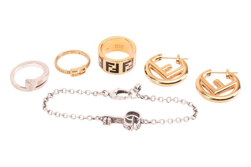 A small collection of designer brand jewellery; to include a Gucci Chiodo nail ring in silver, signed and stamped with Swiss convention marks, size M; a Double G Marmont key charm bracelet, 17.5 cm long, Italian assay marks '925' for silver; total weight of items 12.8 grams; together with a pair of F Is Fendi hoop earrings in gold-toned base metal with post fittings, signed and numbered; a Forever Fendi ring with black enamel logos, gold-toned brass, size M½; and another Fendi FF chain ring in gold-tone finish, size M½. (5)