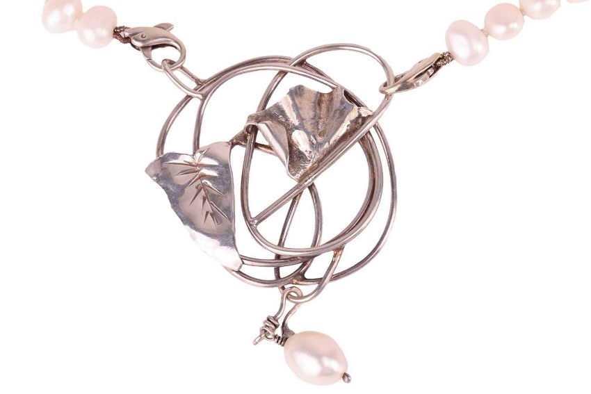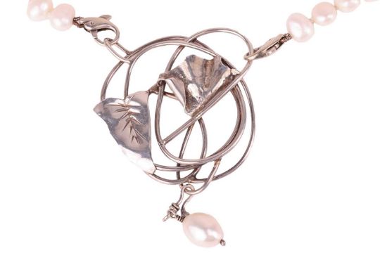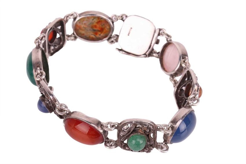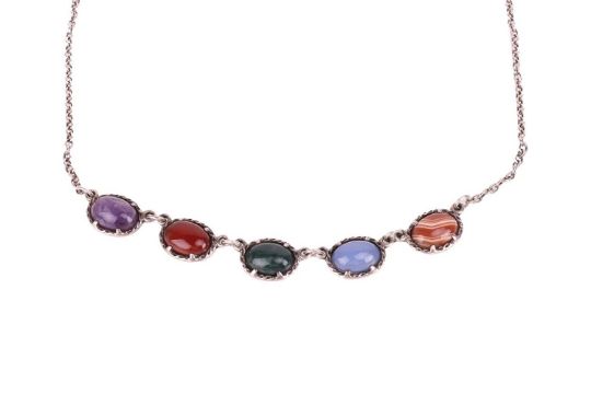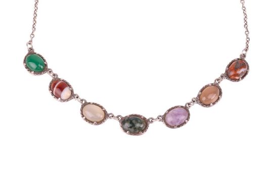 A collection of Scottish agate and quartz set jewellery, to include two necklaces of similar design and two bracelets, all in white metal, one bracelet stamped "SILVER"; together with a flexible filigree necklace in yellow base metal; and a cultured freshwater pearl necklace, featuring a central pendant of organic foliate design with pearl drop, in white metal stamped "925"; total weight of items 148.9g (6).