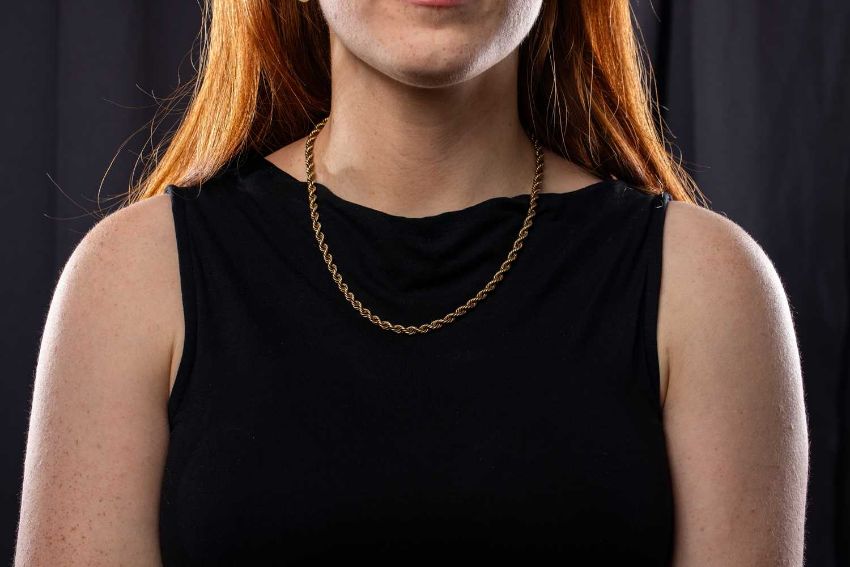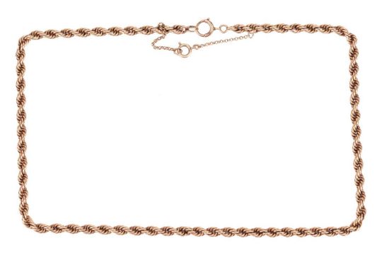 A 9 carat gold rope twist chain, with jump ring clasp and safety chain; hallmarks for Birmingham 1978. 49.5cm length, 34 grams.