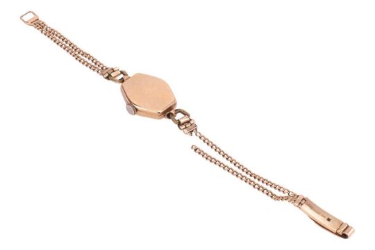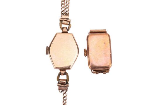 Two 9ct gold watches; The first a Vertex 9ct gold wrist watch, reference 52953, serial number 636514, the lozenge shaped case enclosing an A.S. calibre 1051 seventeen-jewel manual-wind movement, the inside of the case back marked ‘A.L.D’ for Dennison, Hallmarked Birmingham 1954, silvered dial, Arabic numerals, to a potentially later added chain-link strap (deficient), gross weight 13.7 grams; The second a 9ct gold watch with engraved and enamelled detail, reference 6320, the rectangular case enclosing a grey dial with Arabic numerals, the inside of the case back marked with Glasgow import marks for 9ct gold, dated 1927, strap deficient, weighing 7.5 grams.