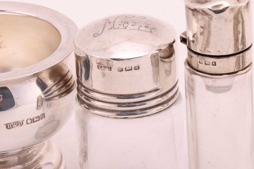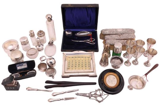 A collection of silver, to include a silver mounted perpetual calendar, a tea strainer and stand, a set of six Kiddush cups, chatelaine scissors and sheath and a quantity of other small silver. 481 grams, 15.4 ozt gross weight of weighable silver.