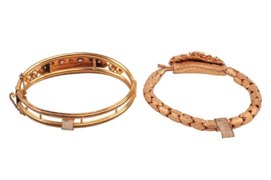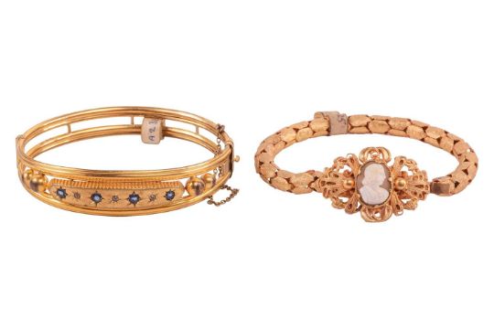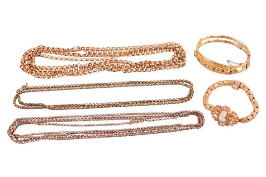 A small group of gilt jewellery items comprising a Victorian cameo-set bracelet, a paste-set hinged bangle and three belcher link chains; 148.9 grams (5)