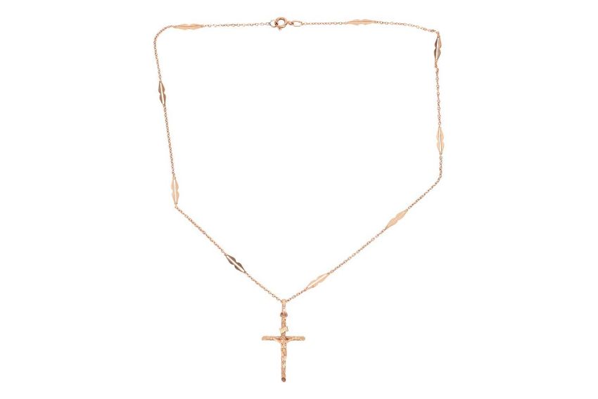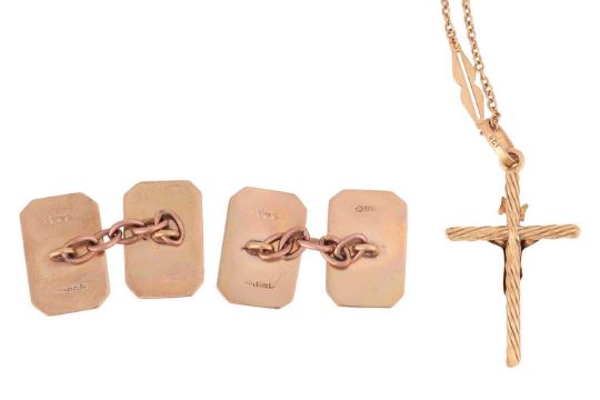 A pair of octagonal panel cufflinks in 9ct yellow gold, a crucifix stamped '9ct' on a 41.0 cm long fancy link chain surface testing as 18ct; total weight of items 8.5 grams. (2)