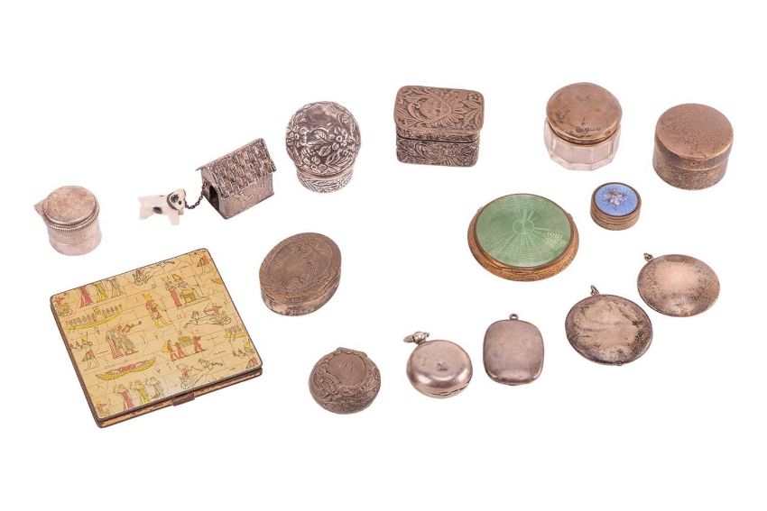 A Victorian silver miniature dog's kennel and associated ceramic figure of a dog, Import marks for Sheffield 1899 by Samuel Boyce Landeck, 3cm high x 3.2 cm wide; together with a Victorian silver pill box, rectangular with putto mask to cover, Birmingham 1890; a small French oval pill box with scene from rural life to cover, a small continental silver and enamel pill box, a plain silver pill box, circular London 1906, two silver and lilac guilloché enamel compacts and a number of other compacts, scent bottle cover and other small wares.