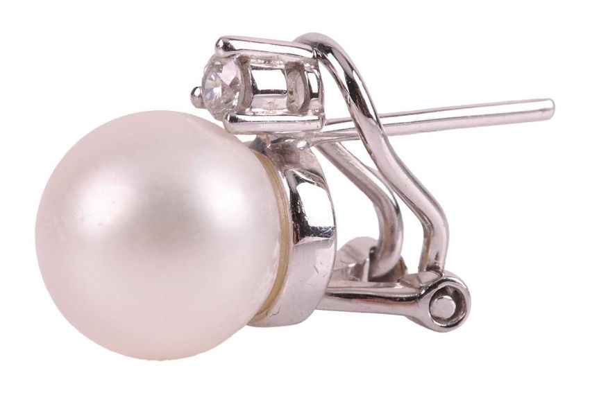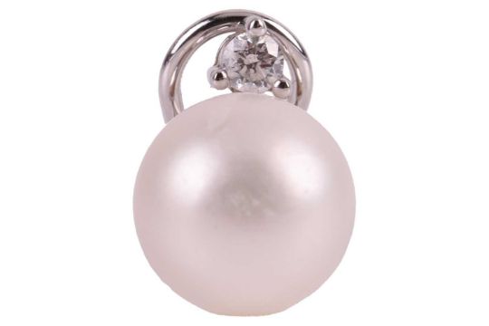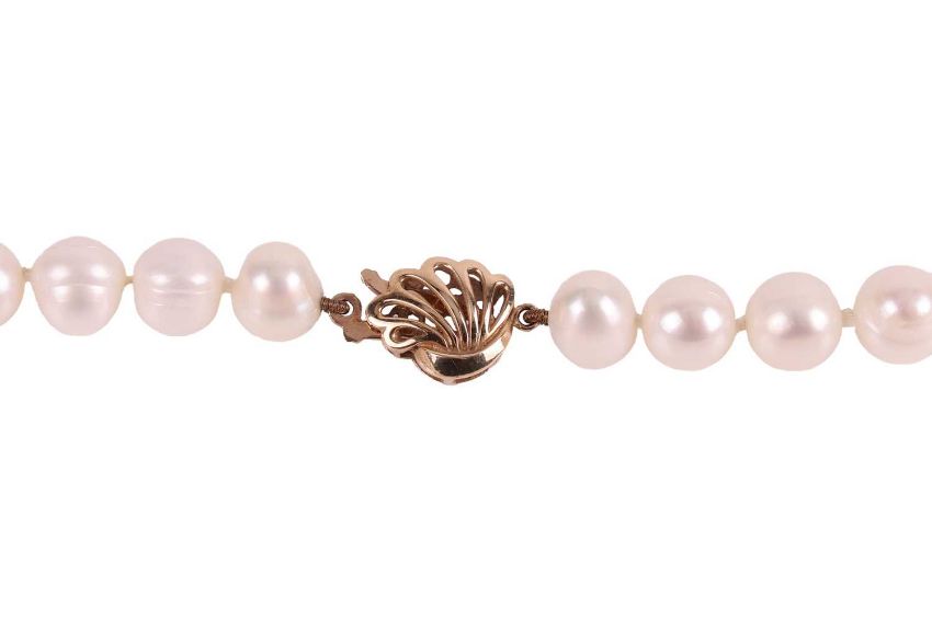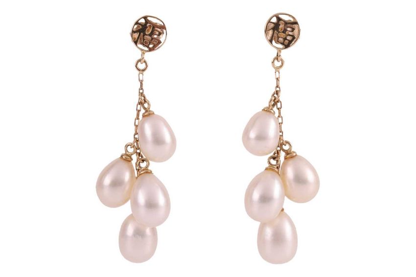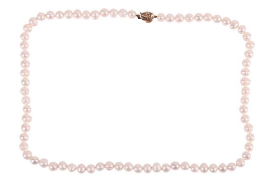 A group of pearl jewellery; to include, a cultured freshwater pearl necklace, the pearls of semi-round form, of ivory colour with pink overtones, individually knotted to a 9ct gold clasp, with London hallmarks, length 61.0 cm; together with a pair of multi-pearl drop earrings, each featuring four cultured pearl drops, suspended from a trace chain and topped with a stud featuring the chinese character for prosperity, to post fittings and butterfly backs, in yellow metal stamped "14K"; and a single simulated pearl stud earring, with a possibly laboratory-grown diamond accent and white metal post with omega back, stamped "375"; total weight of items 55.0 grams (3).