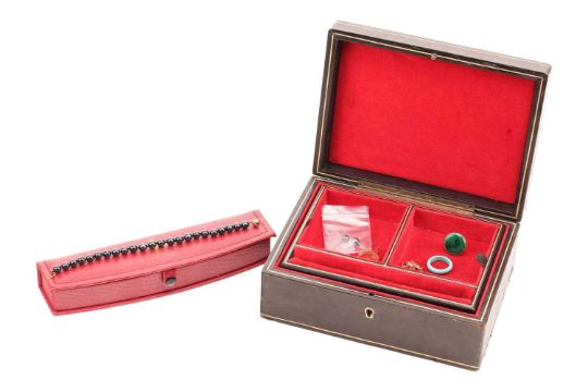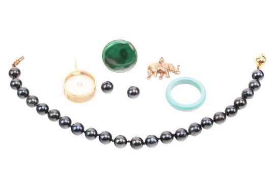 A leather jewellery box and a small collection of jewellery items; to include a boxed cultured pearl bracelet with an 18ct yellow gold ball clasp, with two loose pearls; an elephant charm marked '9ct'; a malachite panel ring testing as 9ct; a diamond in resin pendant marked '18K'; and a reconstituted turquoise carved ring.