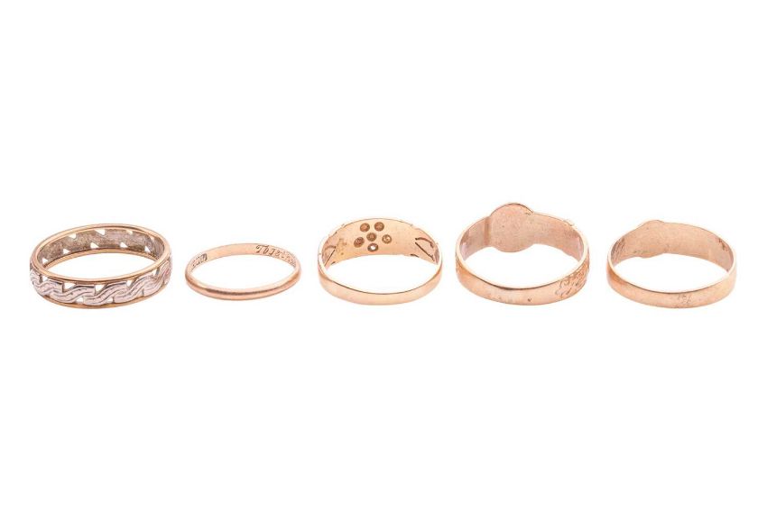 A group of five rings; the first an engraved band ring centred with a flower motif, grain set with five rose-cut diamonds, size M ½, surface tested as 14ct; the second a plain band ring, size J ½, surface tested as 9ct; the third a two tone ring with a central wave motif in white metal, flanked by yellow metal borders, size Q, surface tested as 14ct; the fourth a 9ct gold buckle ring, with scroll detail, size P; the fifth a 9ct buckle ring size O; Total weight 9.6 grams (5).
