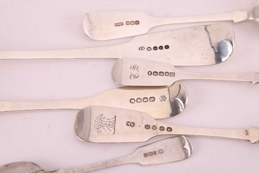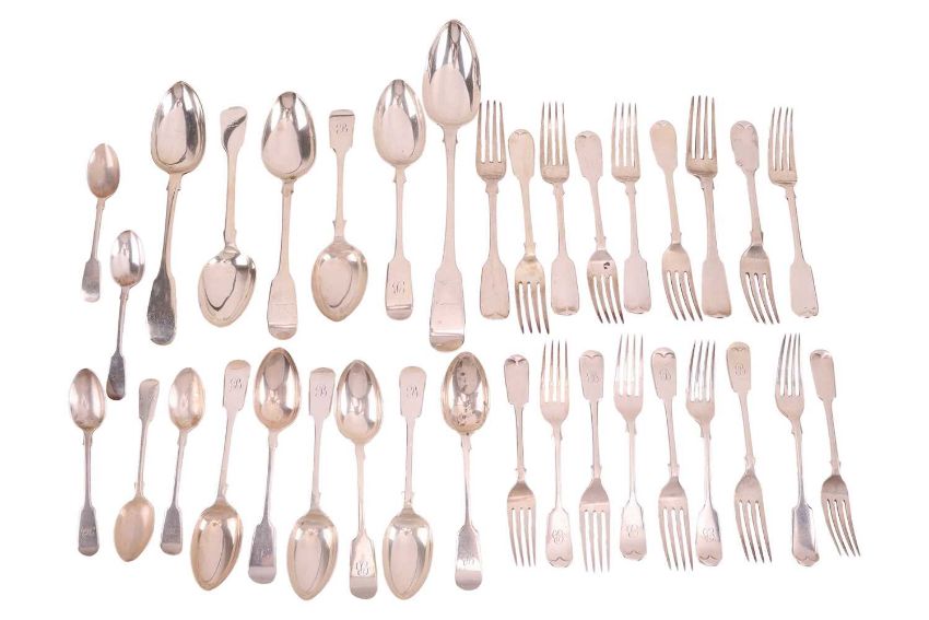 A George III fiddle pattern basting spoon, London 1814, by Thomas Hayter, together with nine fiddle pattern table forks, five fiddle pattern teaspoons, six dessert spoons and nine dessert forks, mixed dates and makers. 55.1 ozt, 1714 grams.