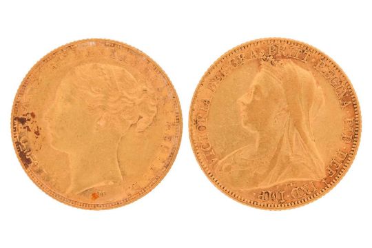 Two Victorian gold sovereign coins, including 1885 "Young Head" (Melbourne Mint), and 1899 "Old Head", 15.9 grams combined weight, 21 mm diameter.