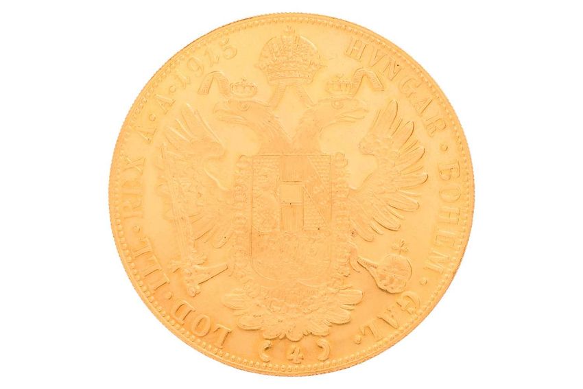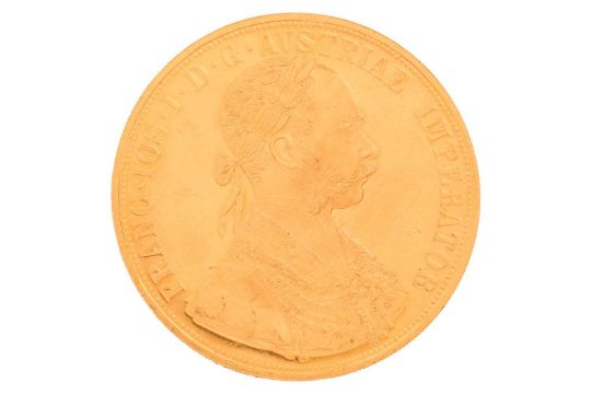 An Austrian 1915 four ducat gold coin, 14 grams, 38 mm diameter